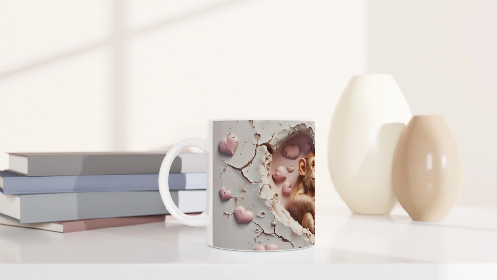 Kırık beyaz duvarda açılmış kalp şeklindeki boşluktan bakan sevimli maymun ailesi, pembemsi kalplerle bezeli arka planla birleşerek sevgi dolu bir sahne oluşturuyor. Özellikle hayvanseverler ve aile temalı hediyelik arayanlar için mükemmel bir tercih.