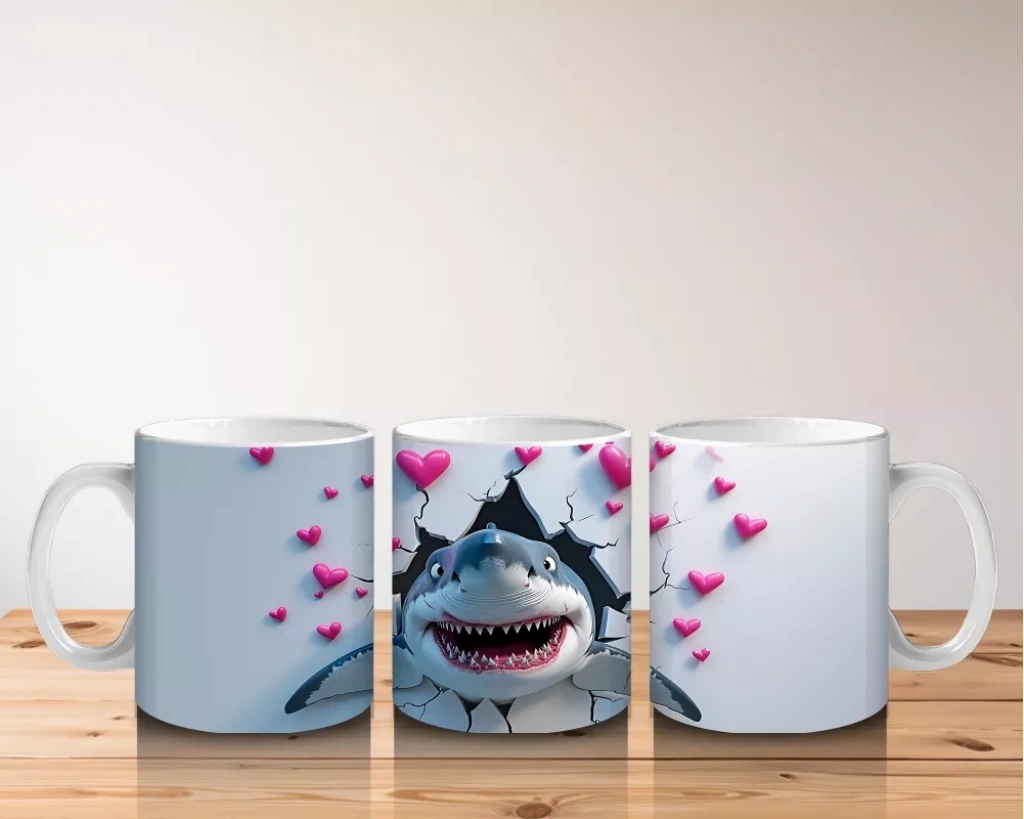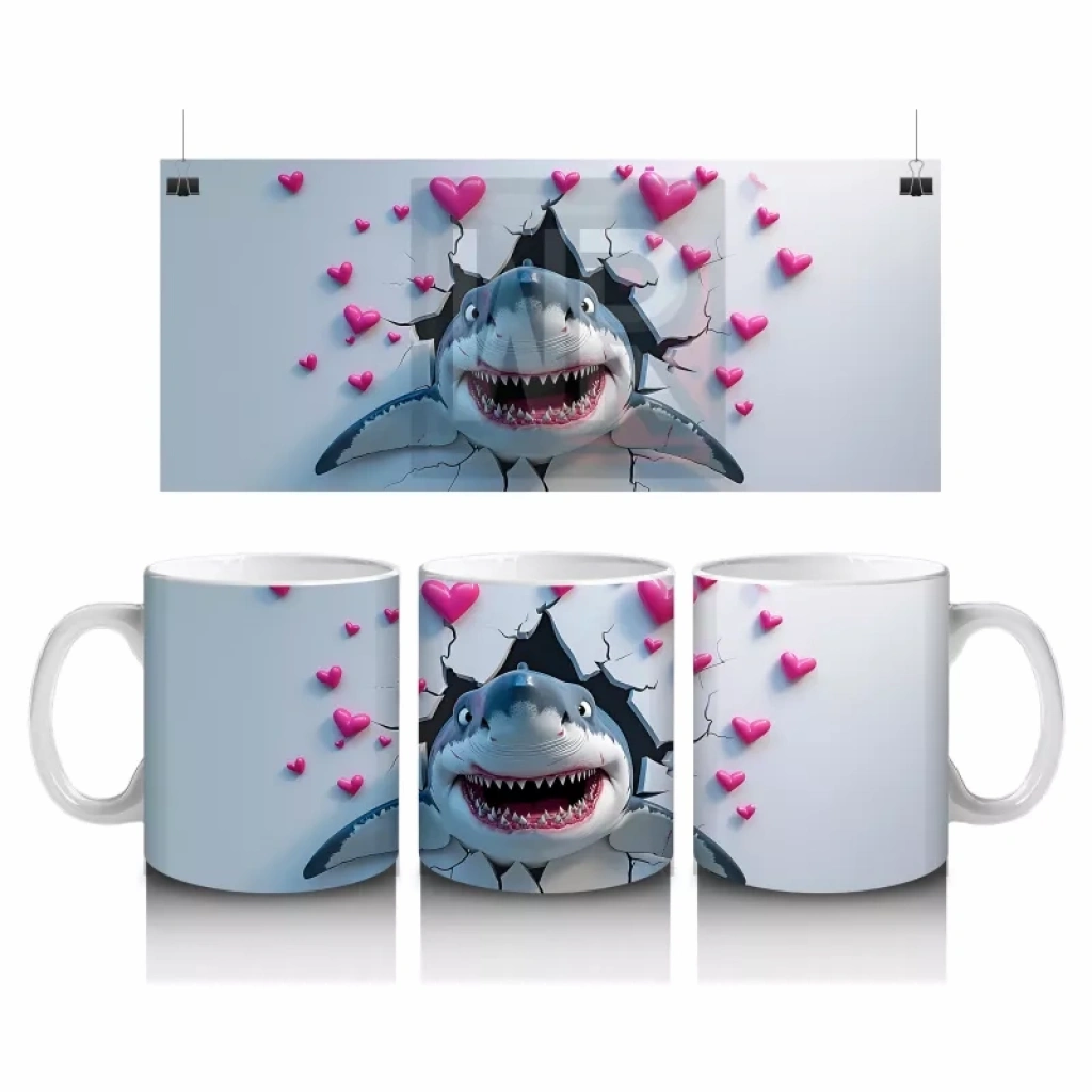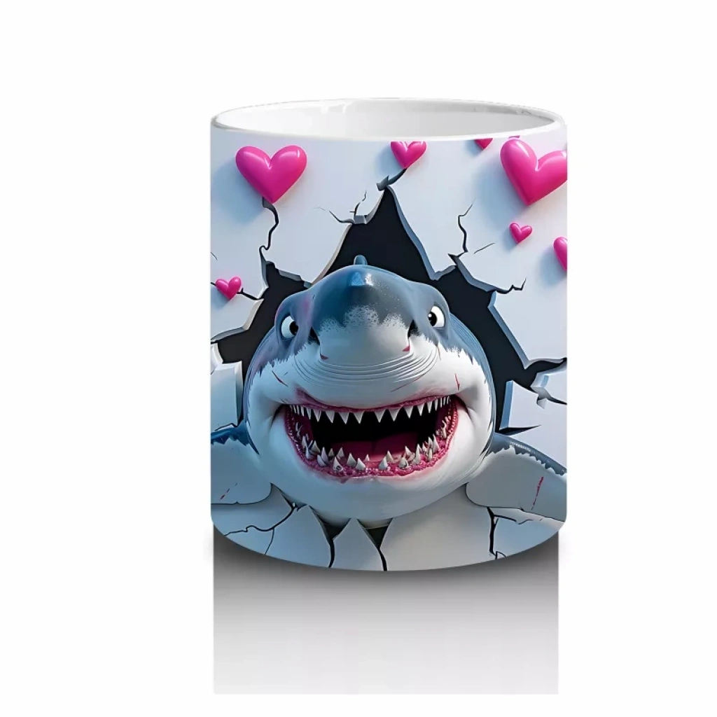 Pembe kalplerle süslenmiş arka planda keyifle yüzen bu neşeli köpekbalığı, eğlenceli tarzıyla dikkat çekiyor. Hem çocuklar hem de ruhu genç kalanlar için ideal.