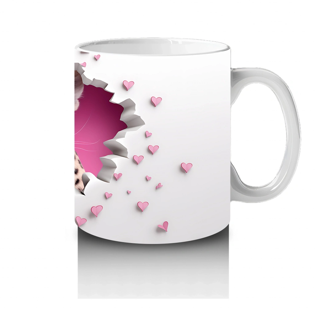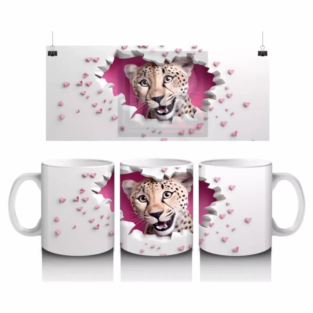 Kalp desenli duvar önünde duran leopar, vahşi ve romantik detayları bir arada sunuyor. Cesur ve duygusal tasarımlardan hoşlananlar için etkileyici bir kupa.