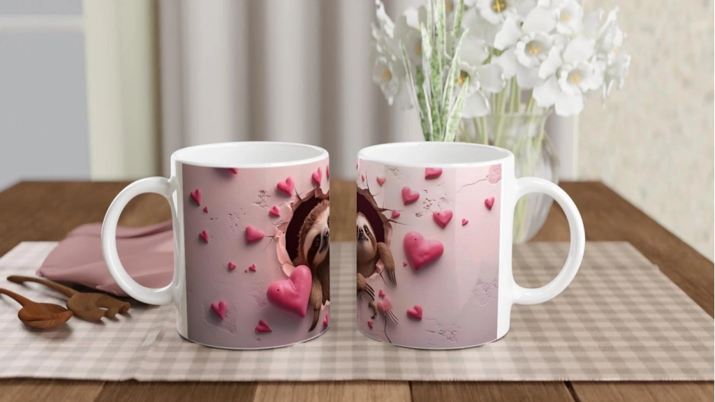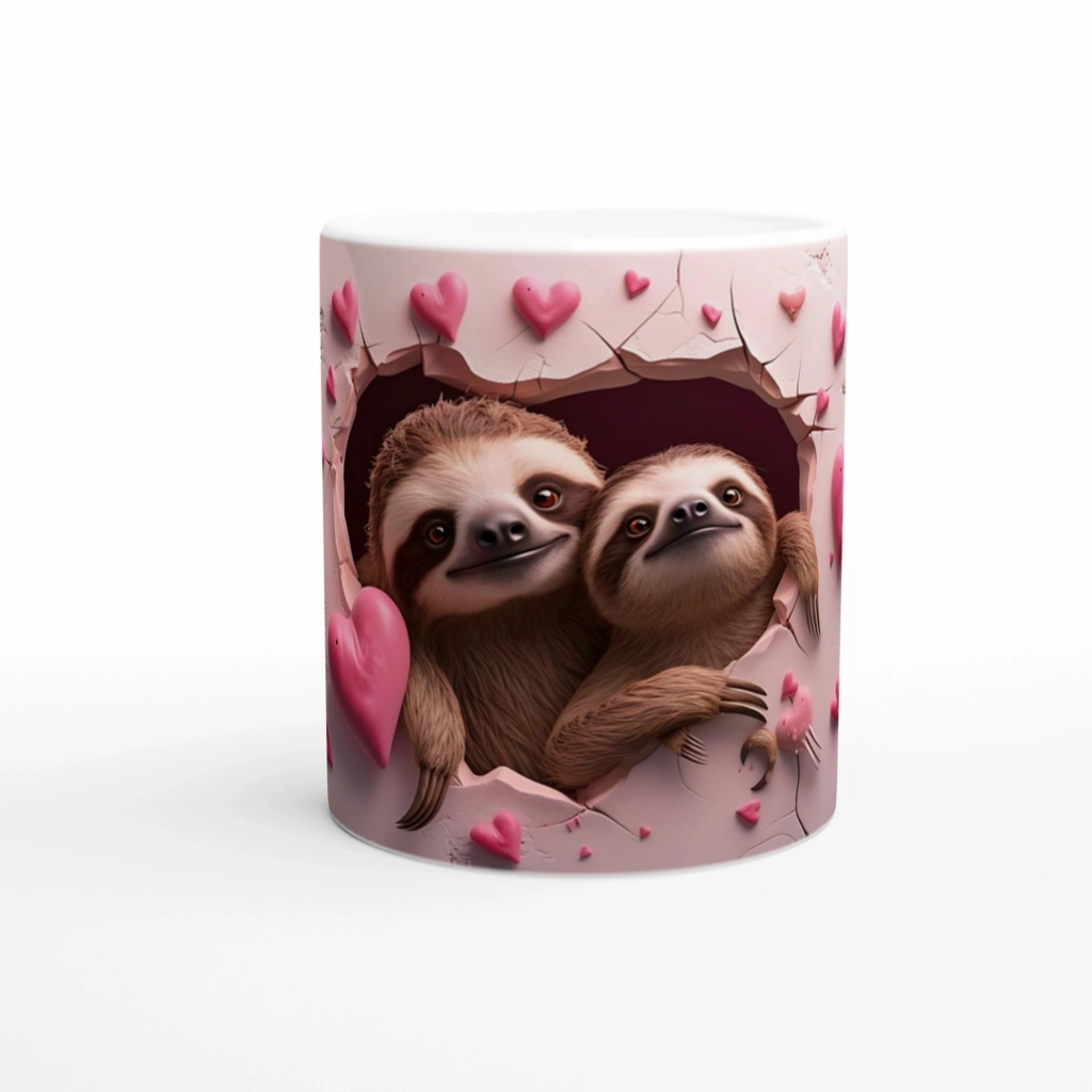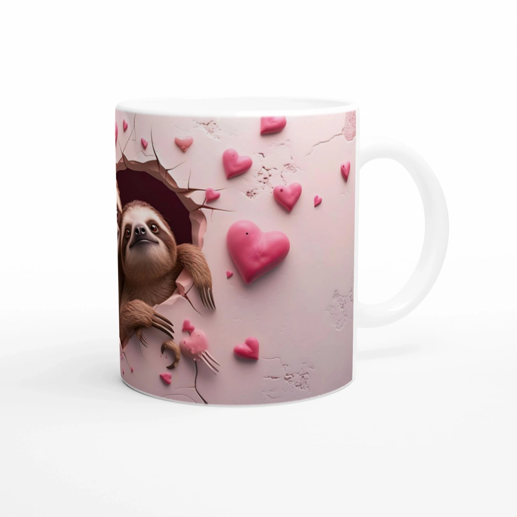 Pembe kalplerle süslenmiş çatlak duvardan sevimli şekilde bakan iki tembel hayvan, bu kupaya eğlenceli ve pozitif bir hava katıyor. Günün stresini unutturacak bu tasarım, keyifli kahve molalarının vazgeçilmezi olacak.
