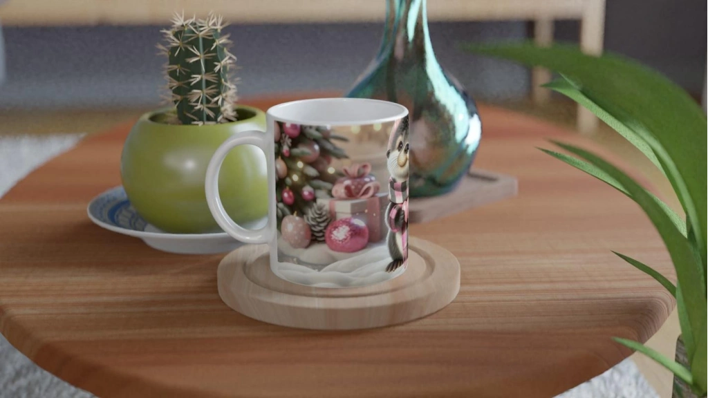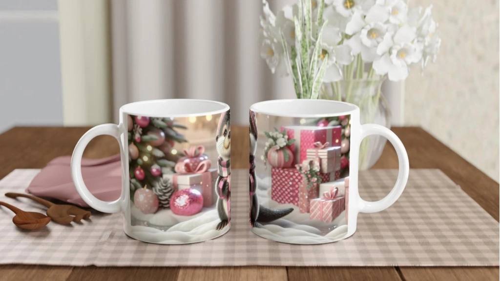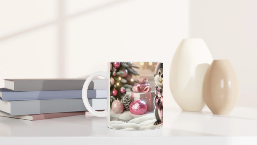 Kalpli Kışlık Şapkalı Su Samuru Temalı Baskılı Kupa Bardak, pembe armağanlarla süslenmiş arka plan, kar taneleriyle bezeli bir atmosfer ve kalp tutan sevimli samur figürüyle yılbaşı ruhunu yansıtır. Neşeli, duygusal ve unutulmaz bir hediye alternatifi sunar.