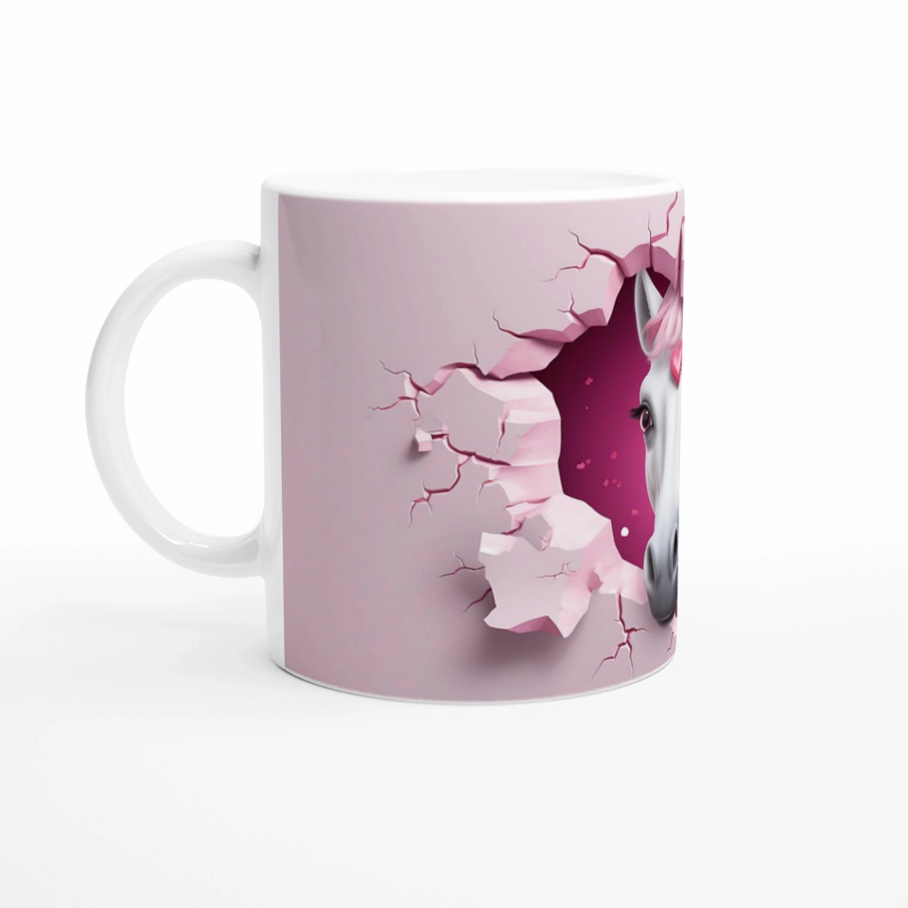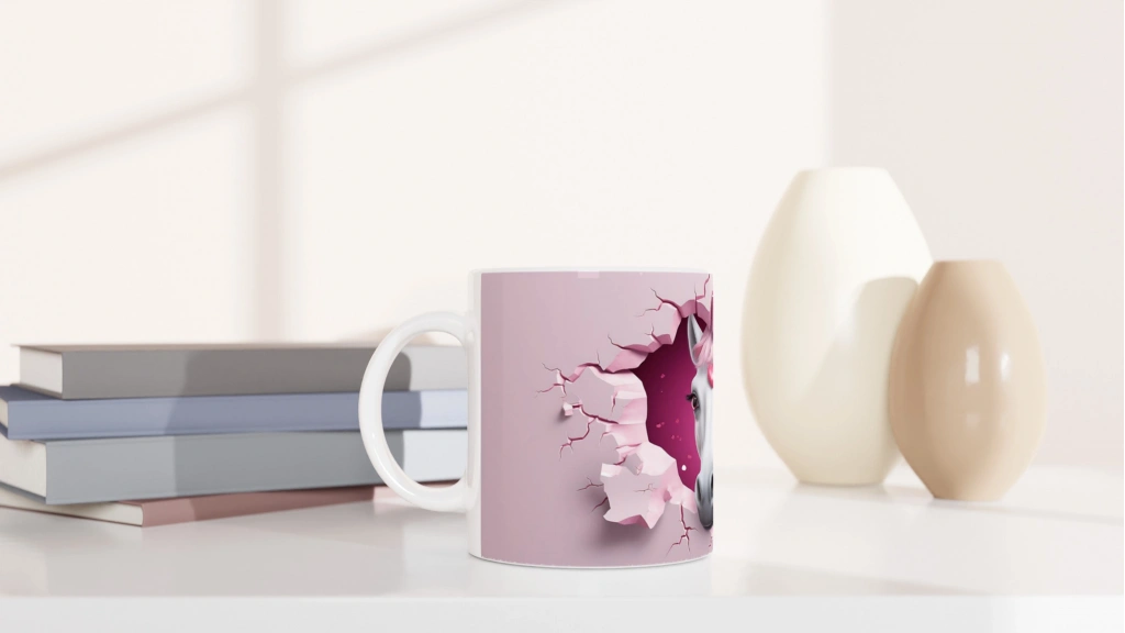 Kalpli Pembe Yeleli At Temalı Baskılı Kupa Bardak, çatlamış duvar efektiyle öne çıkan ve alnındaki kalp figürüyle sevgi temalı bir atmosfer sunan özel bir tasarım. Masalsı ve zarif detayları sevenler için eşsiz bir hediye alternatifi.