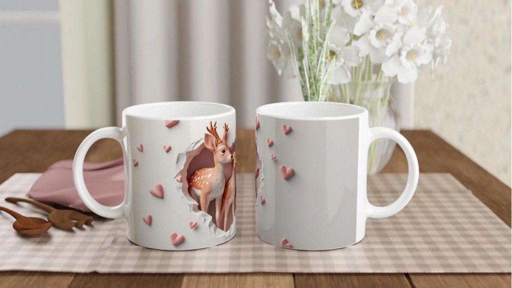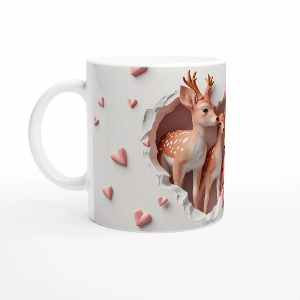 Kalp şeklindeki çatlamış duvar efektiyle çevrelenmiş sevimli geyik ailesi tasarımı, huzur ve bağlılık temasıyla öne çıkıyor. Her yudumda doğayla iç içe bir his yaşamak isteyenler için özel olarak tasarlanmıştır. Aile bağlarını simgeleyen bu kupa, sevgi dolu bir hediye alternatifi.