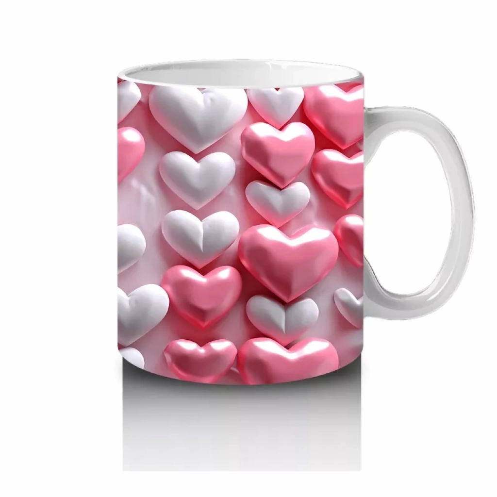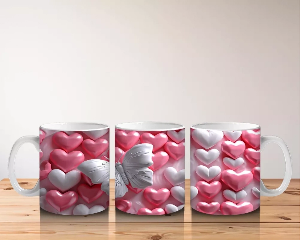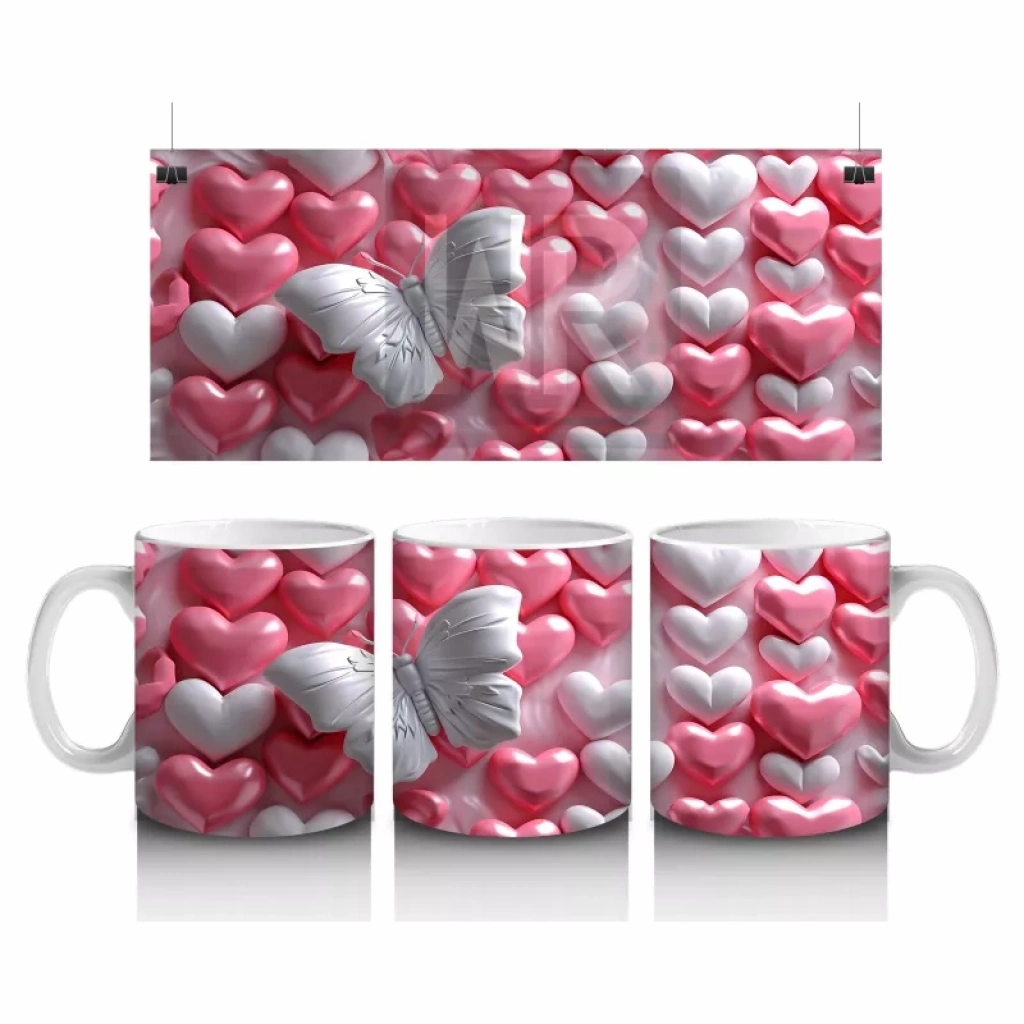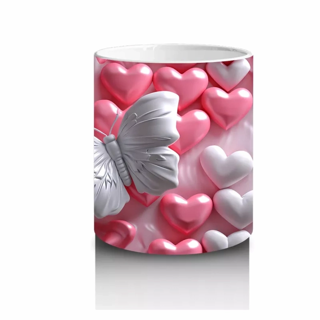 Kalp desenli yastıkların üzerinde nazikçe duran beyaz kelebek, sevgi ve huzur dolu bir atmosfer yaratıyor. Romantik ve sakin tasarımları sevenler için özel bir kupa.