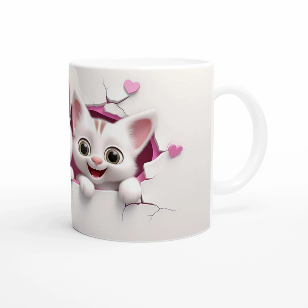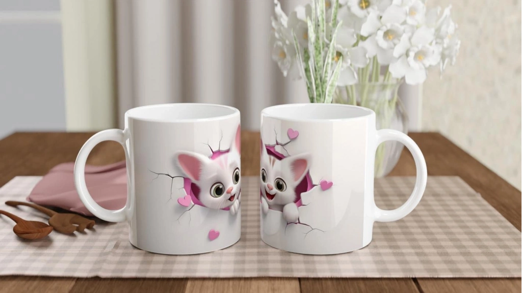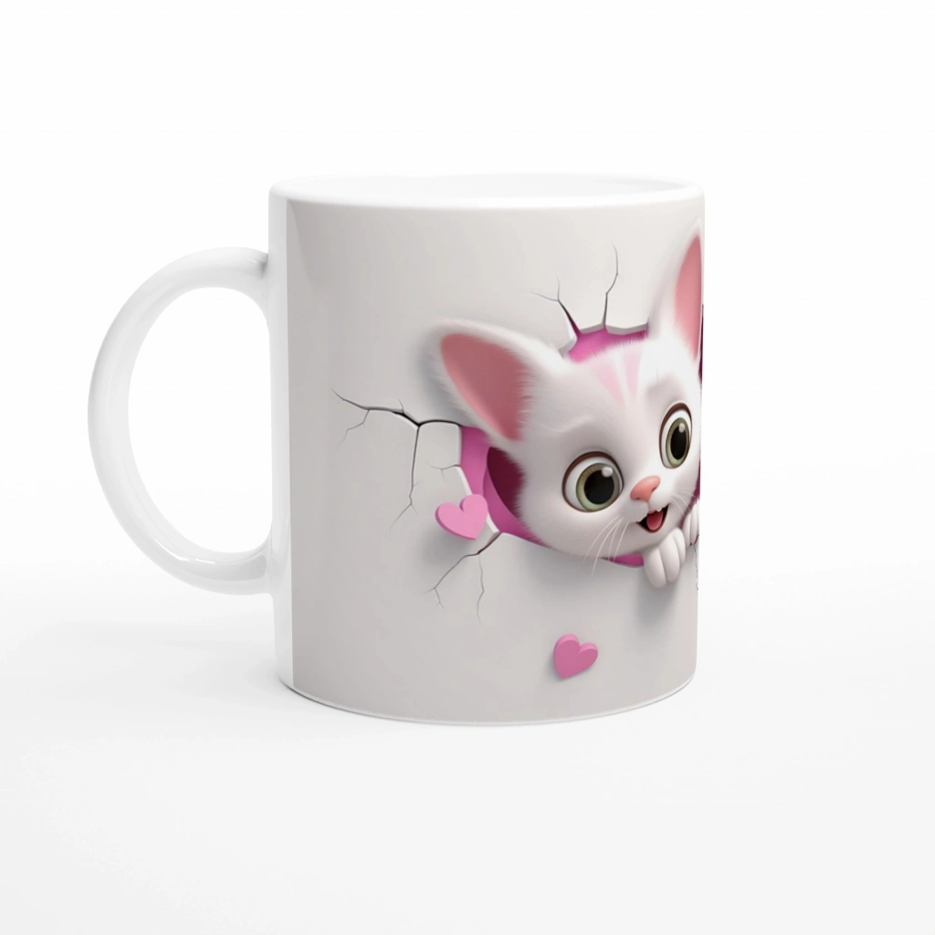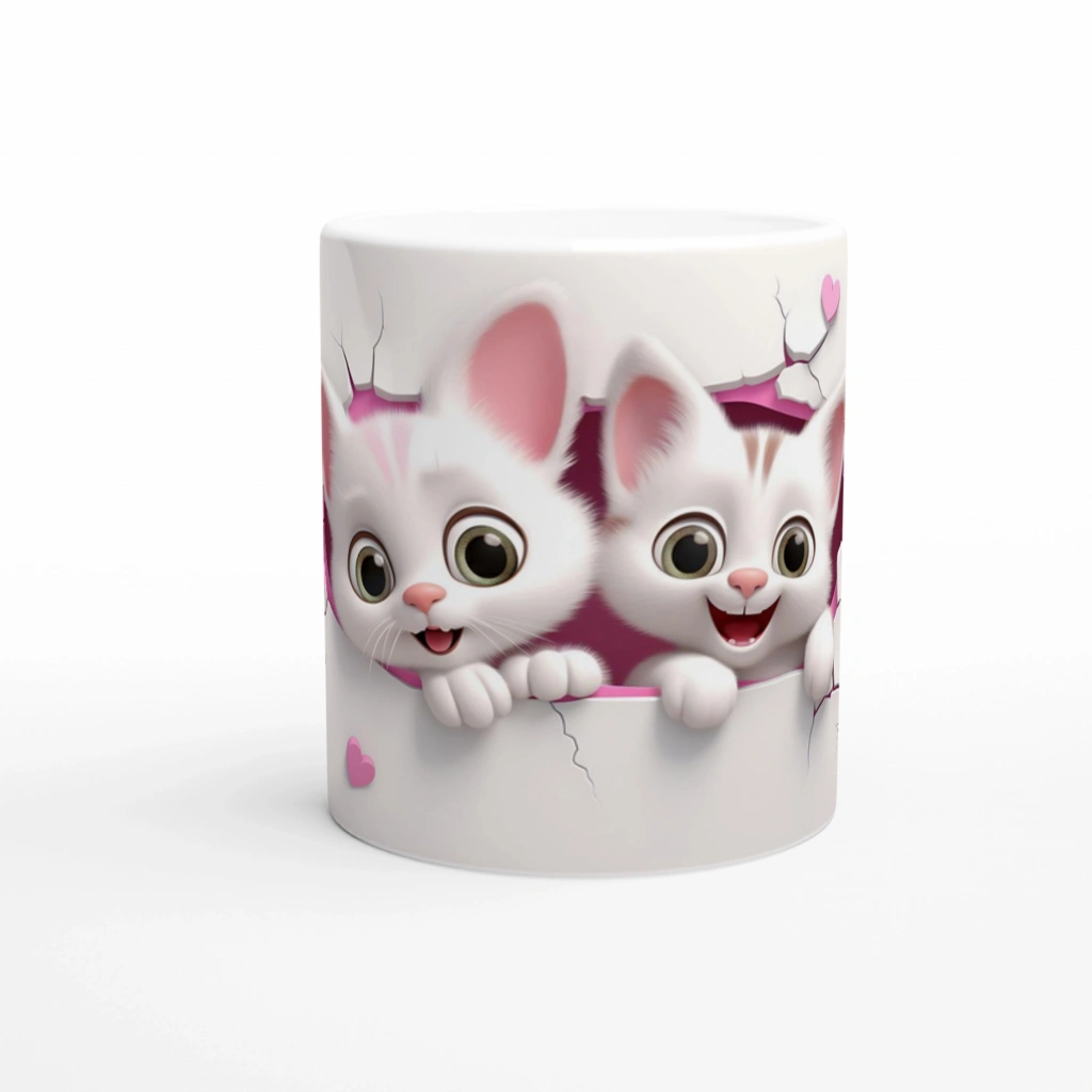 Kalpten Bakan Sevimli Kedi Kardeşler Temalı Baskılı Kupa Bardak, pembe çatlak duvardan birlikte bakan iki beyaz yavru kedinin masum ve sevimli bakışlarını yansıtıyor. Kalplerle bezeli bu özel tasarım, özellikle kedi severler için vazgeçilmez bir tercih.