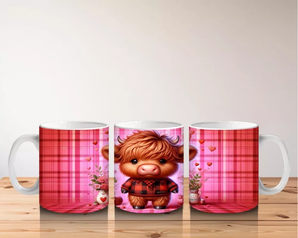 Kareli Arka Planda Çiçek Tutan Sevimli Buzağı – Baskılı Kahve Kupası