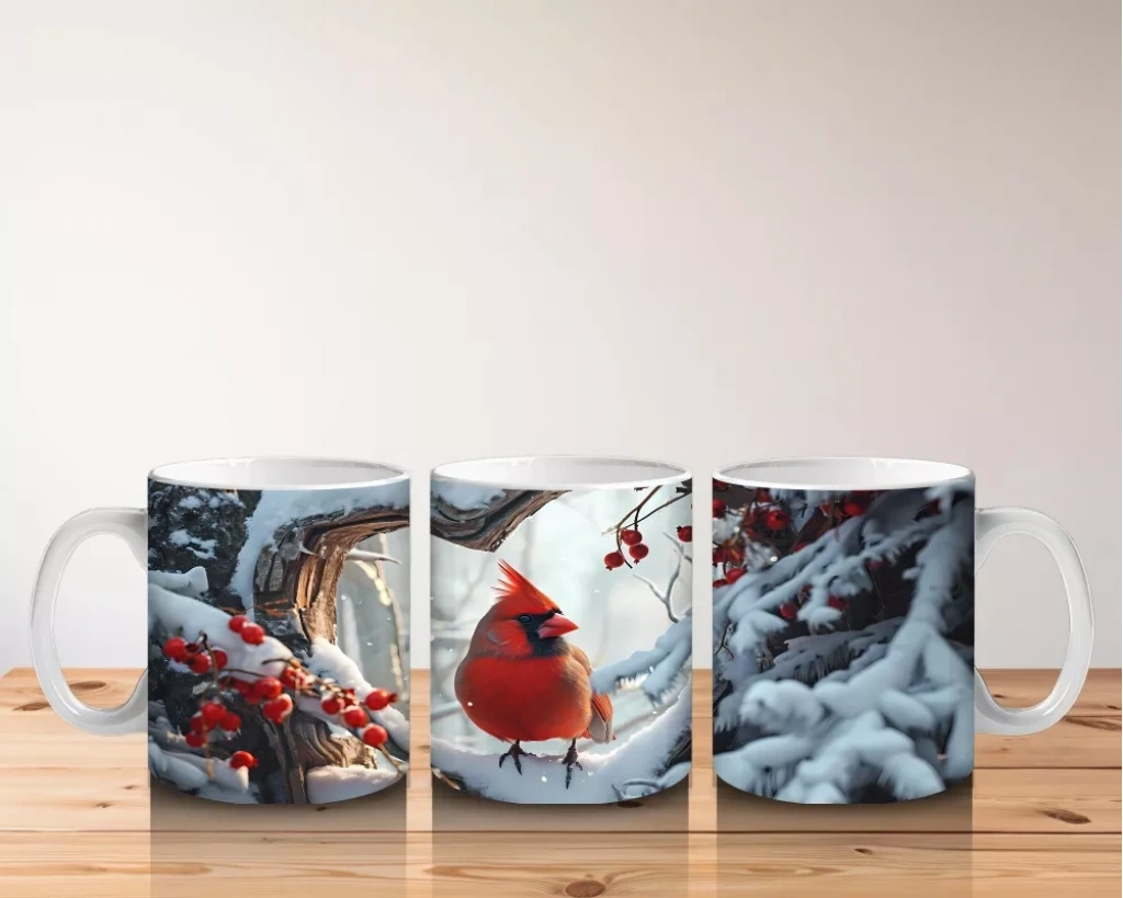 Karlı Dallar Üzerinde Kırmızı Kardinal Kuş – Baskılı Kahve Kupası