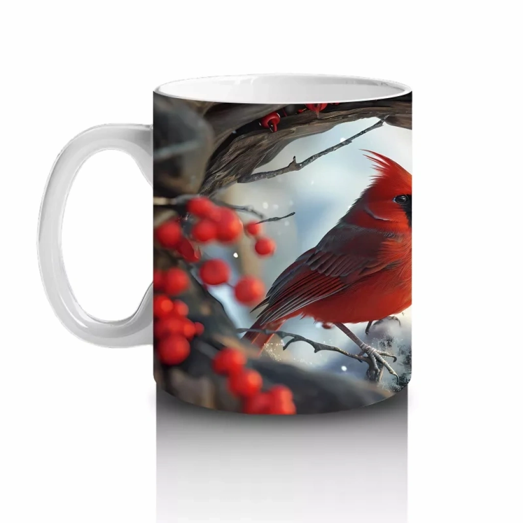 Karlı dallar üzerinde duran kardinal kuş çifti, sevgi ve doğallığı simgeliyor. Romantik ve doğa temalı detayları sevenler için sıcak ve özel bir kupa.