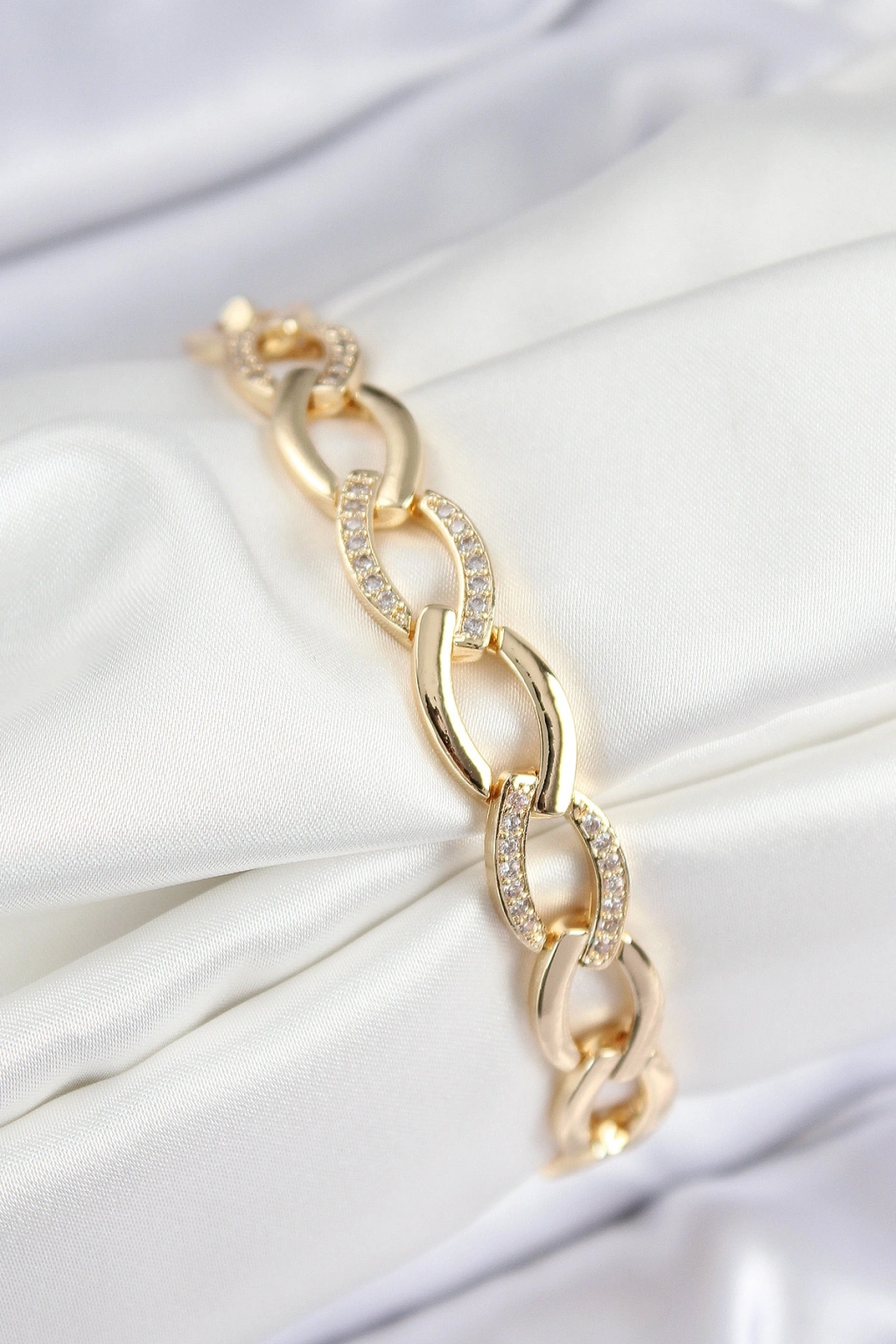 Pirinç Zirkon Taşlı Zincir Model Gold Renk Kadın Bileklik