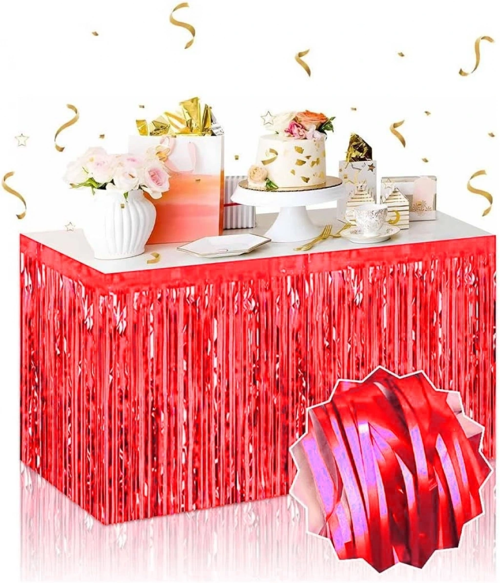 Canlı kırmızı tonuyla partinize enerji ve şıklık katın! 75 x 275 cm ölçülerindeki kendinden yapışkanlı kırmızı metalize püsküllü masa eteği, doğum günü, yılbaşı, sevgililer günü, mezuniyet, nişan ve tüm kutlamalarda masa dekorasyonunuzu tamamlar.