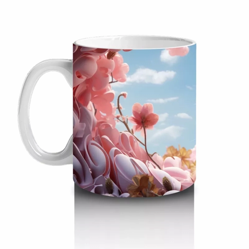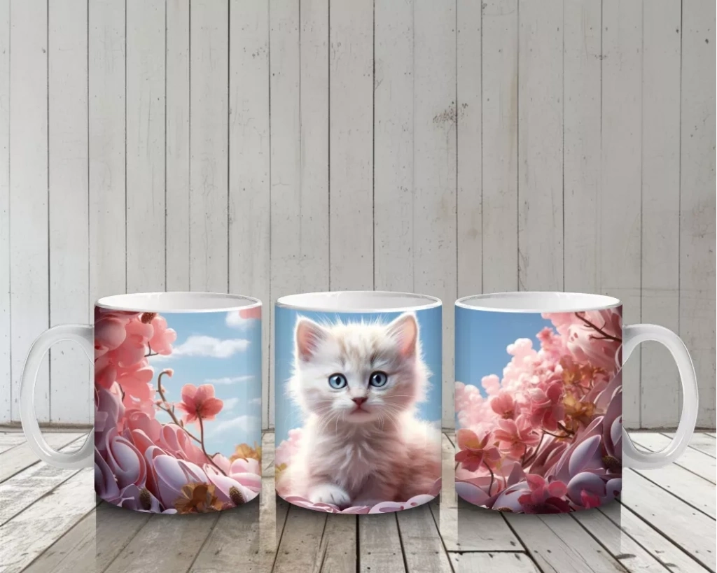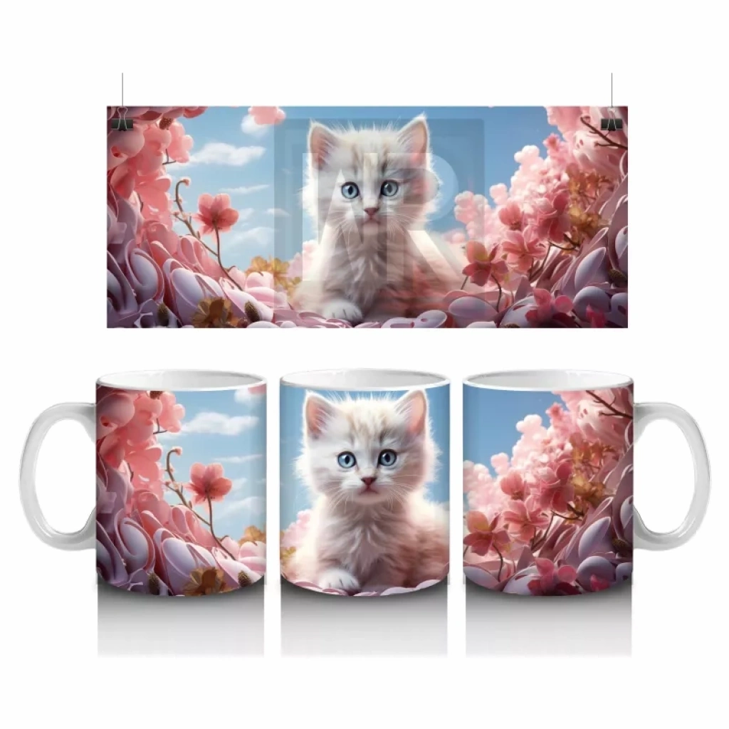 Kiraz Çiçekleri Arasında Oturan Mavi Gözlü Kedi – Baskılı Kahve Kupası