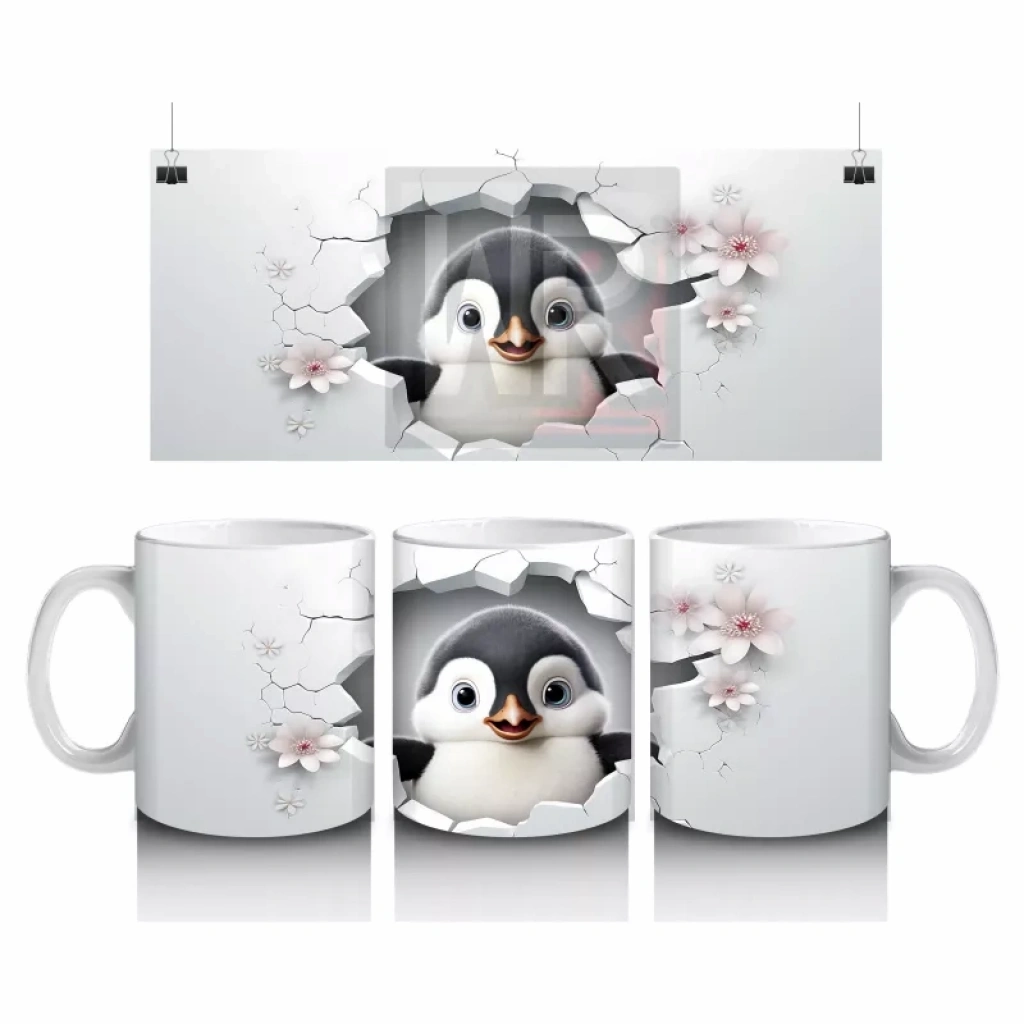 Kiraz Çiçekli Zemin Üzerine Penguen Figürü – Baskılı Kupa
