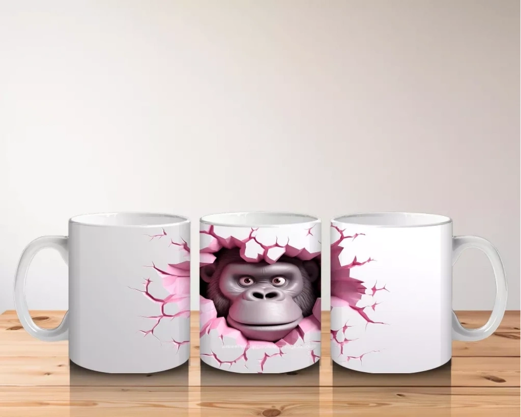 Kırık duvarın arasından dikkatle bakan gri goril, hem meraklı hem de sempatik bir hava katıyor. Farklı ve dikkat çekici kupa tasarımlarından hoşlananlara özel.