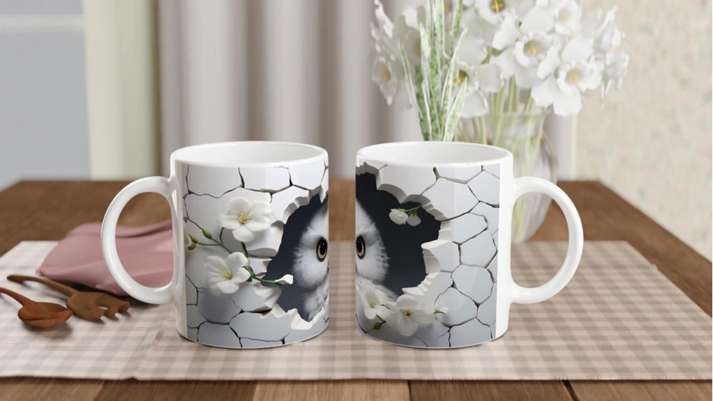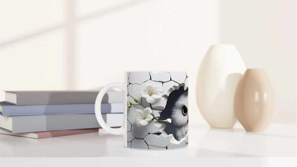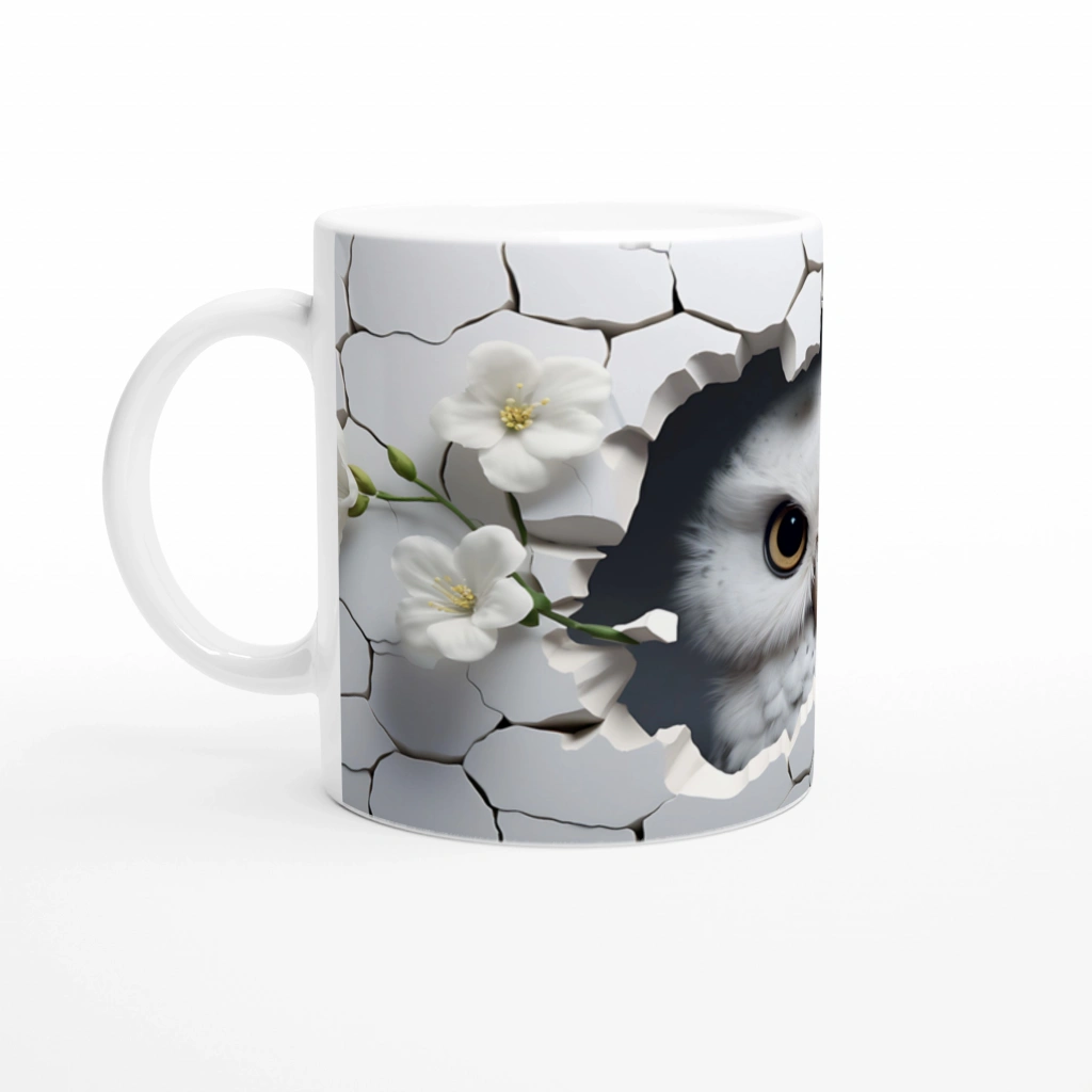 Kırık Seramikten Bakan Beyaz Baykuş Baskılı Kupa Bardak, sade beyaz çiçek detayları ve zarif tasarımıyla hem estetik hem de anlam yüklü bir görünüm sunuyor. Doğadan ve sembolizmden ilham alanlar için eşsiz bir tercih.
