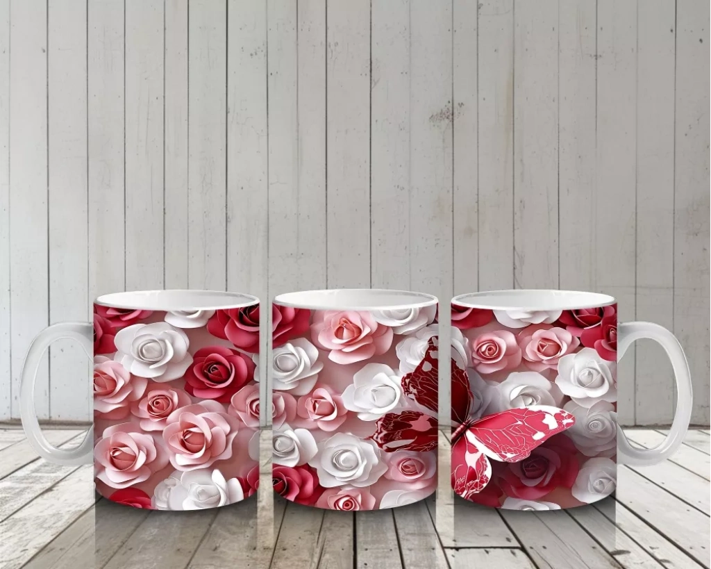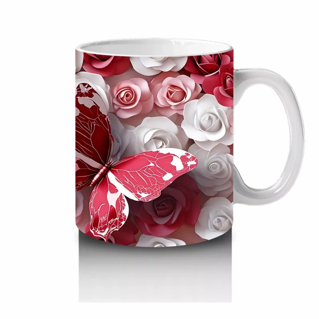 Kırmızı Beyaz Gül Bahçesinde Uçan Kelebek – Baskılı Kahve Kupası
