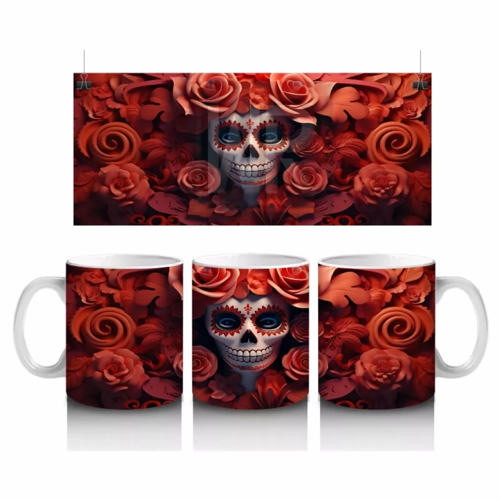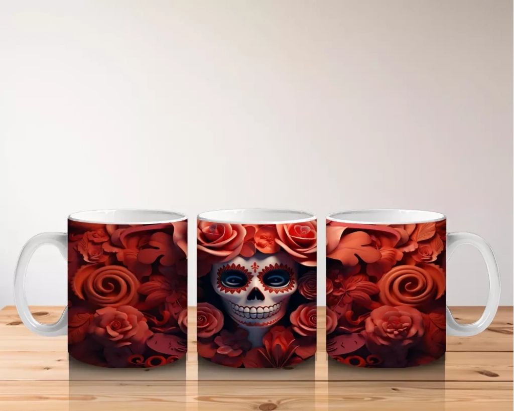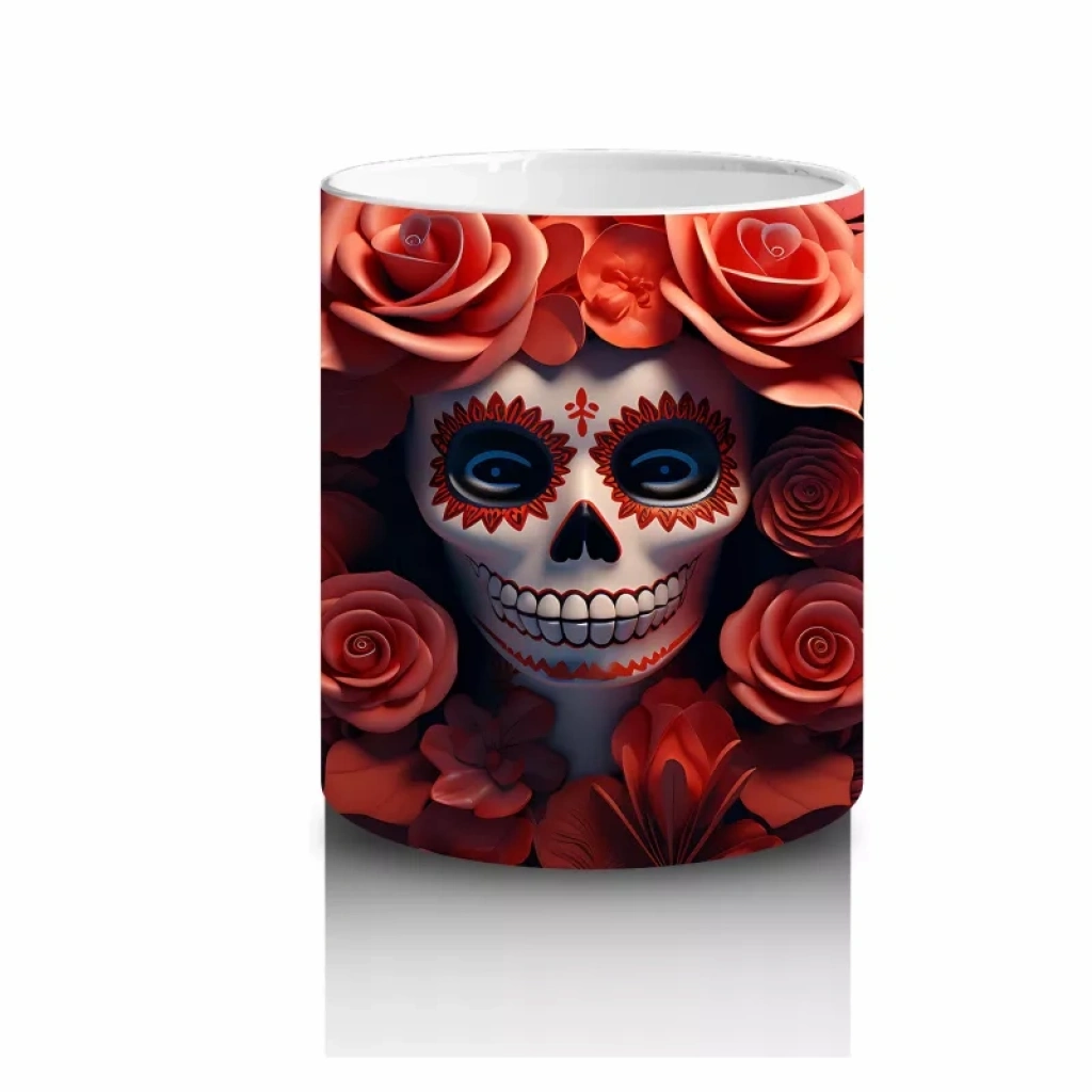 Kırmızı Gül Duvarı Önünde Gotik Kafatası – Hediyelik Kahve Kupası Kırmızı gül arka planı ve gotik kafatası figürüyle dikkat çeken bu baskılı kupa, karanlık estetik tutkunlarına hitap eder. Şık bir Cadılar Bayramı hediyelik kahve kupası olarak öne çıkar.