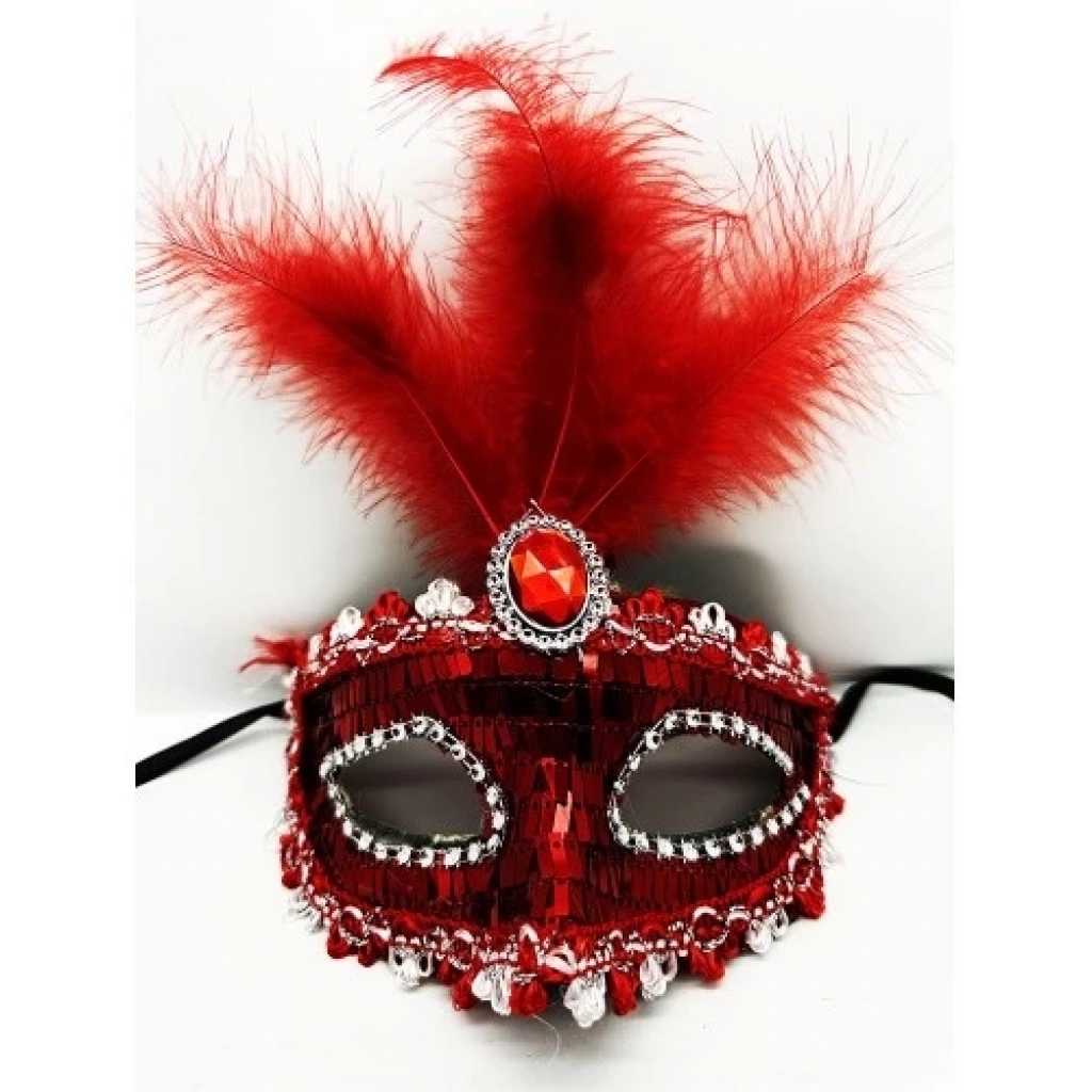 Kırmızı Payetli Pullu Tüylü Parti Maskesi