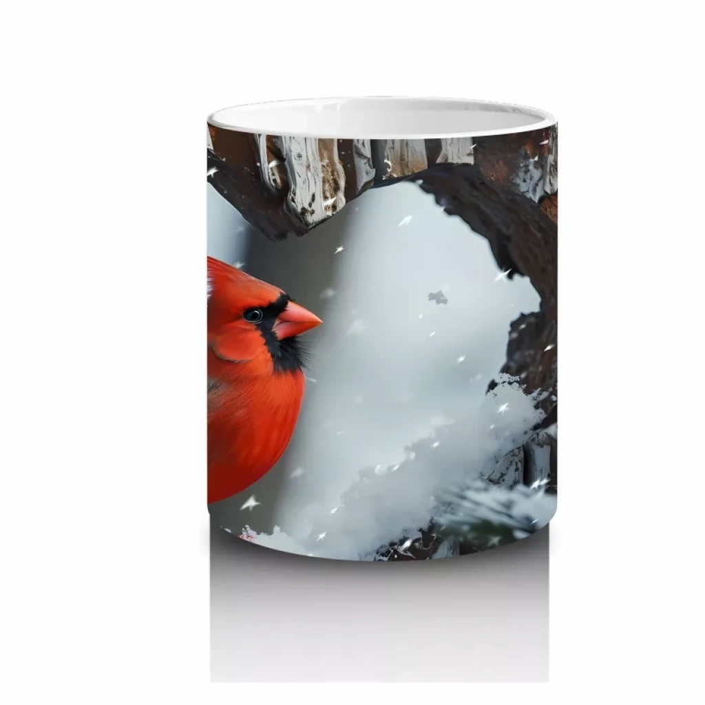 Karla kaplı dalların arasında parlayan kırmızı kardinal kuşu, kışın dinginliğini ve doğanın canlılığını yansıtıyor. Soğuk mevsimlerin zarif ve renkli simgesi bu tasarımla buluşuyor.