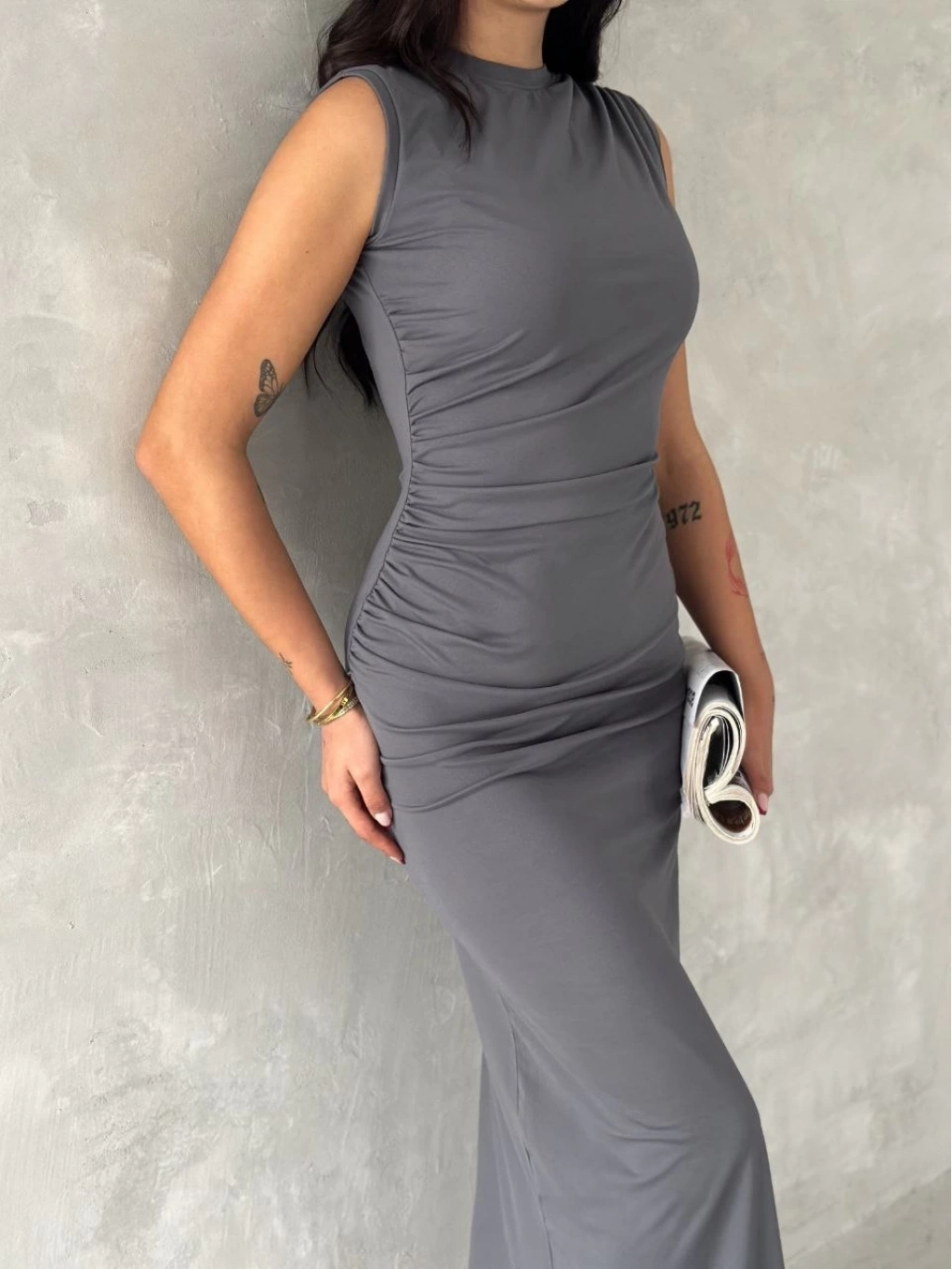 Kolsuz Yırtmaçlı Uzun maxı boy Elbise - Gri