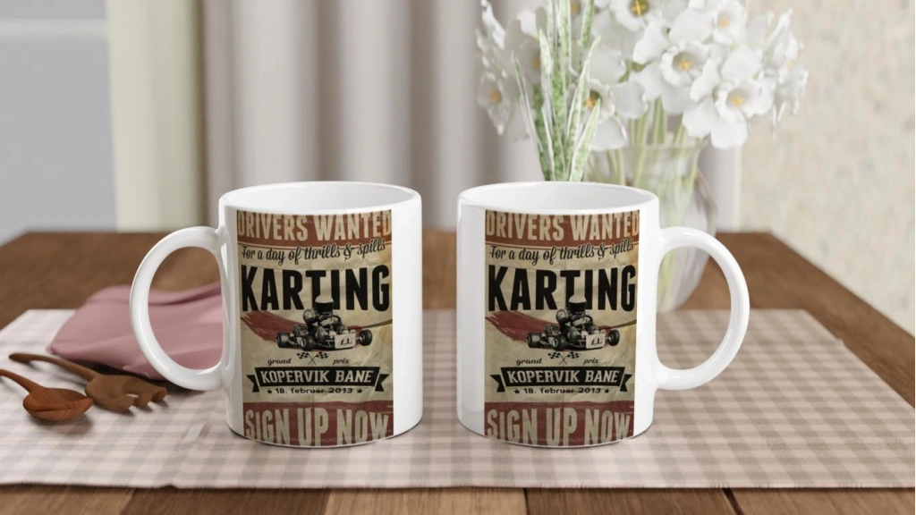 Retro karting afişinden ilham alan bu bardak, hız ve heyecan sevenler için enerjik bir hediye alternatifi sunar.