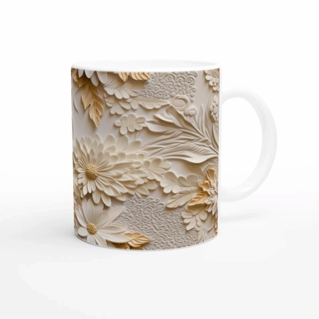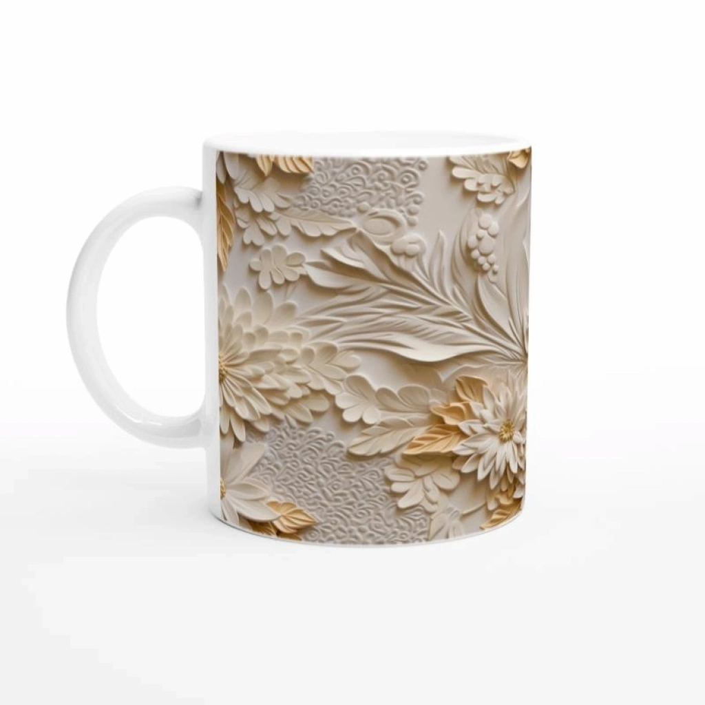 Krem Tonlu Rölyef Çiçek Desenli Kupa Bardak