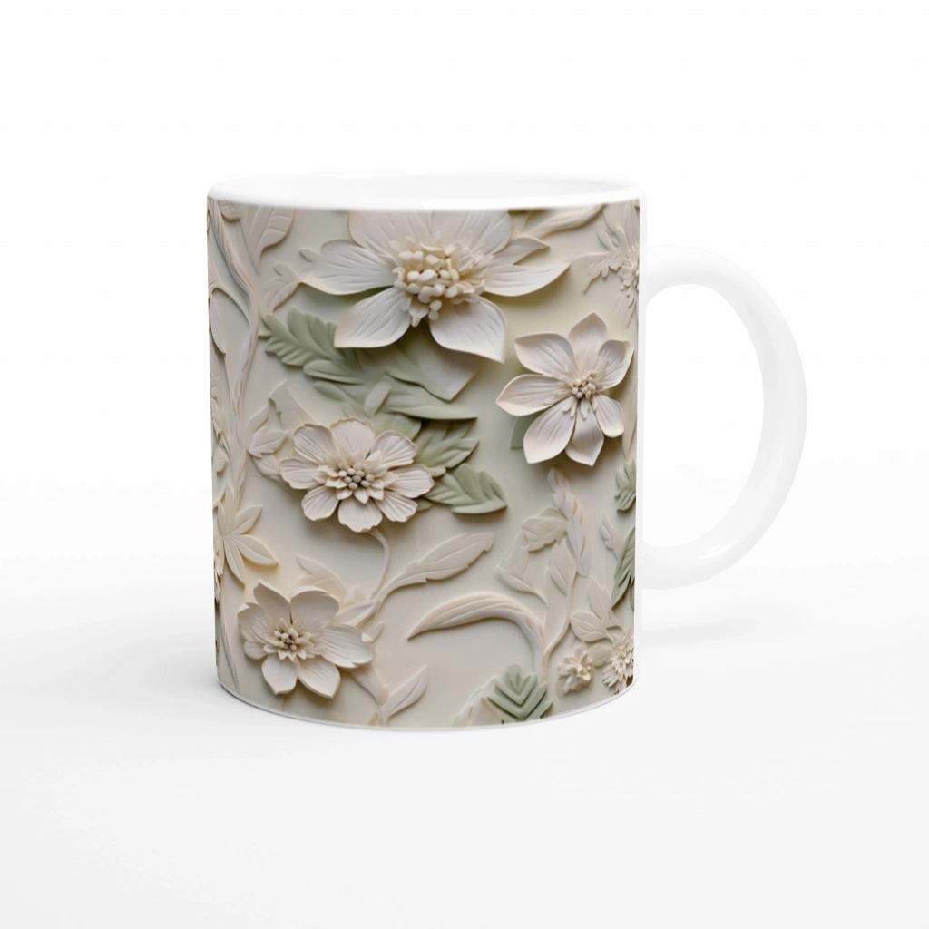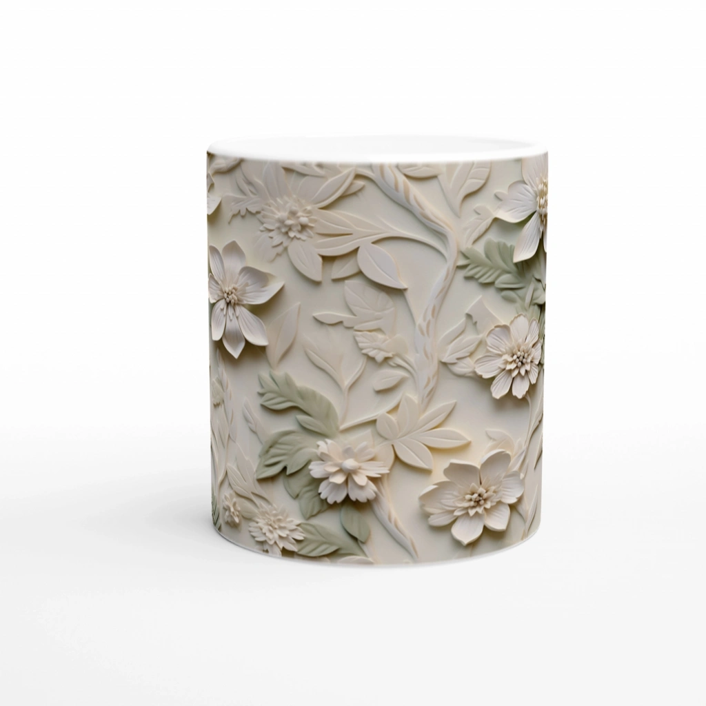 Krem ve Yeşil Rölyef Çiçek Desenli Kupa Bardak