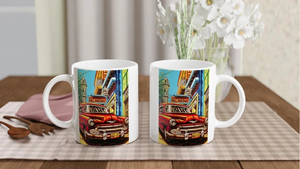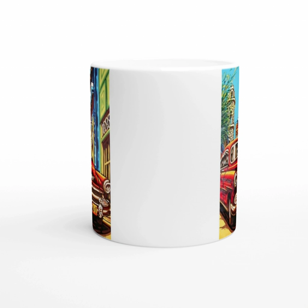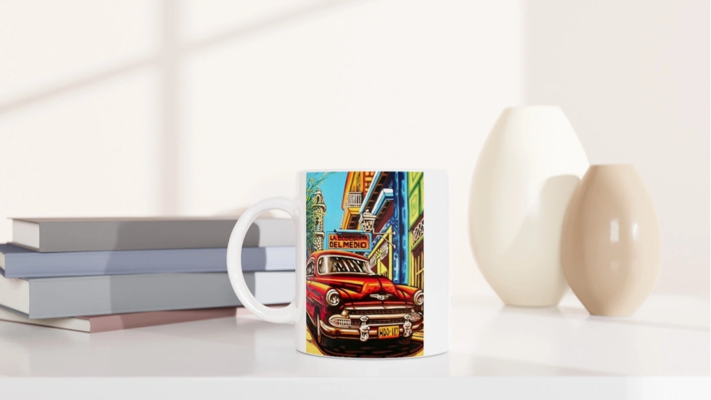 La Bodeguita Del Medio tabelası ve eski model arabasıyla bu kupa bardak, retro Küba havasını kahve molalarınıza taşıyor.