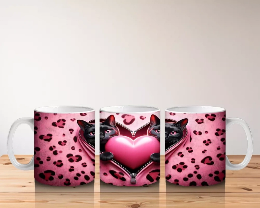 Leopar desenli arka planda yan yana duran aşık kediler, vahşi ve romantik temaları başarılı bir şekilde birleştiriyor. Dikkat çekici ve duygusal bir kupa alternatifi.