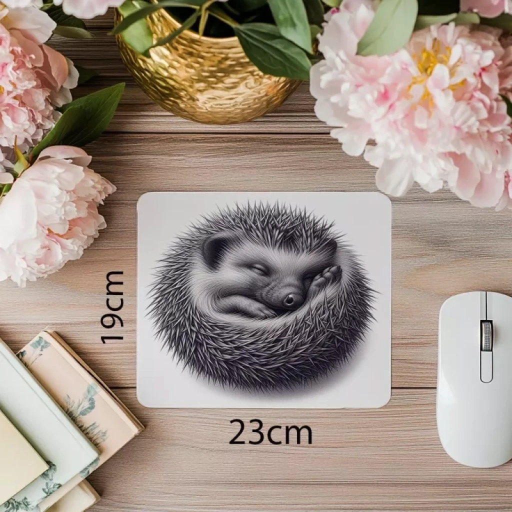 Mat gri arka planlı kirpi karakalem illüstrasyonlu mousepad, dayanıklı yüzeyi ve kaymaz tabanı sayesinde kesintisiz ve konforlu kullanım sunar.
