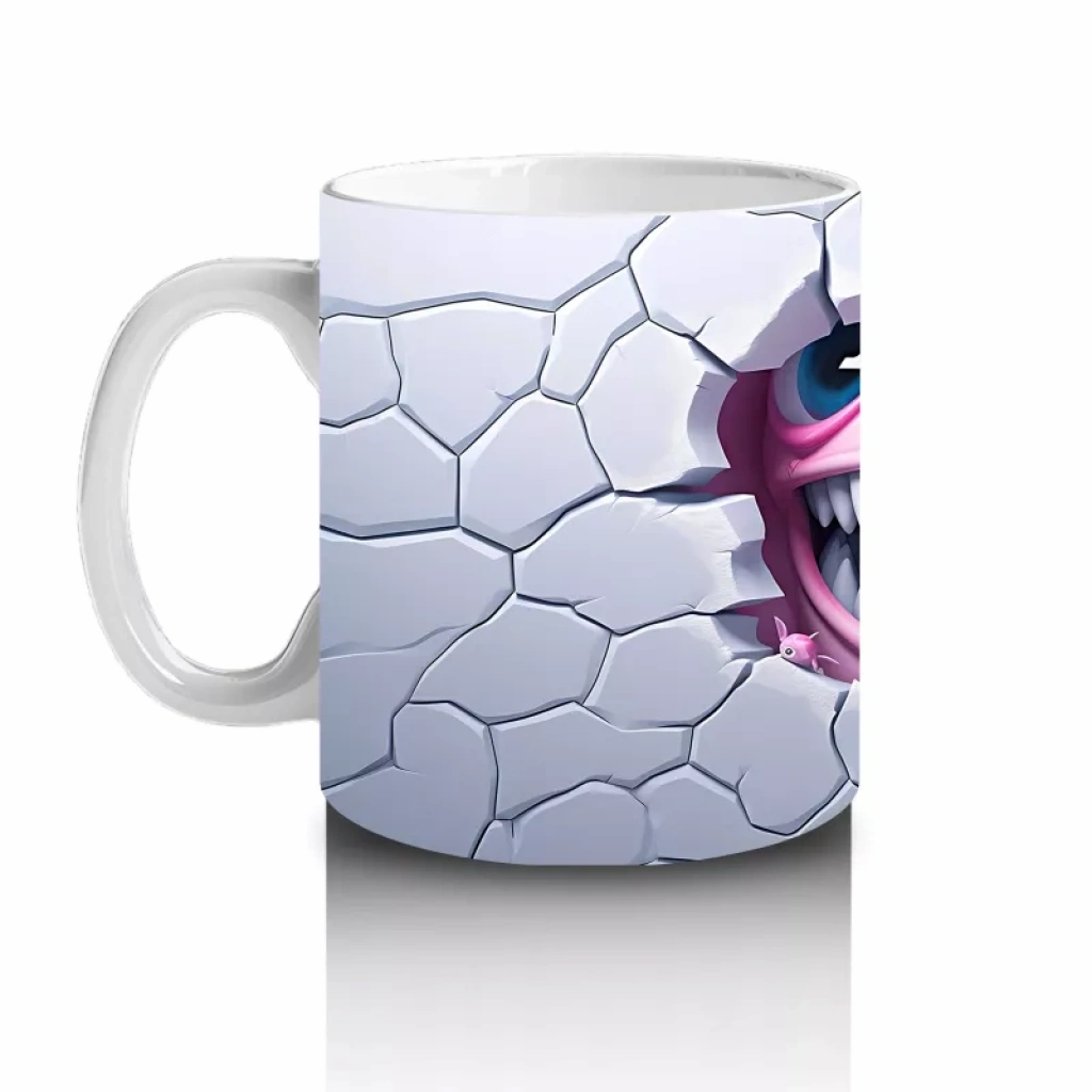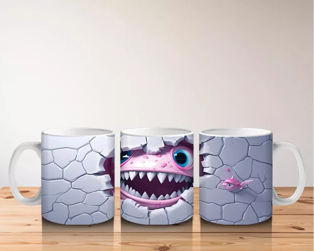 Mavi çatlaklar arasında pörtlek gözleriyle şaşkın bir köpekbalığı! Mizah dolu bu tasarım, kahve molalarına enerji katıyor.