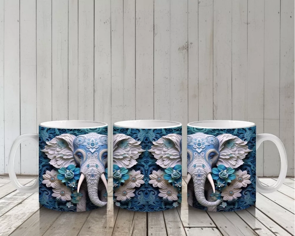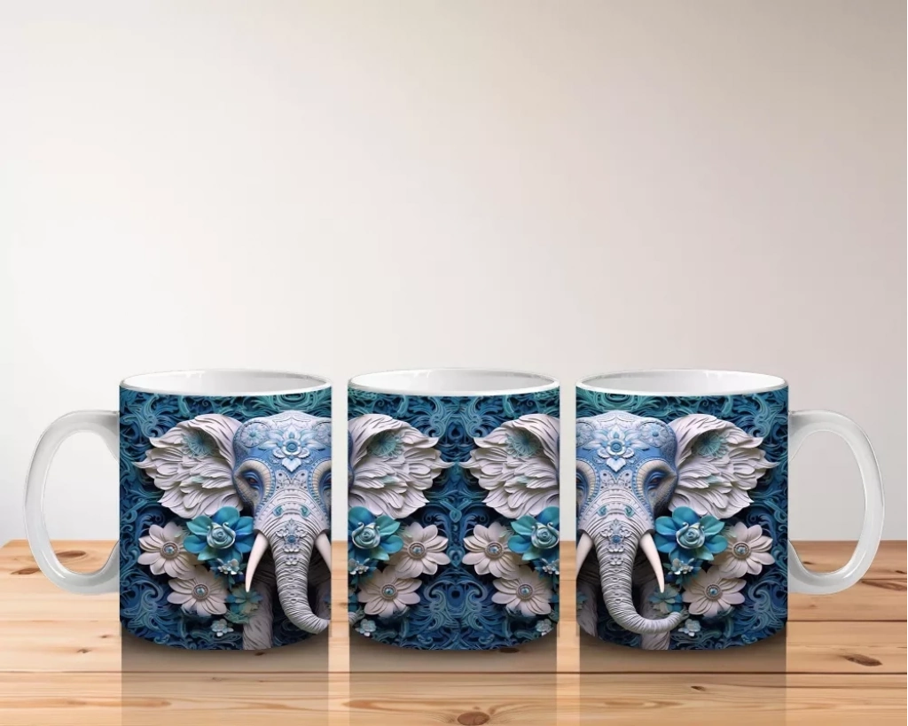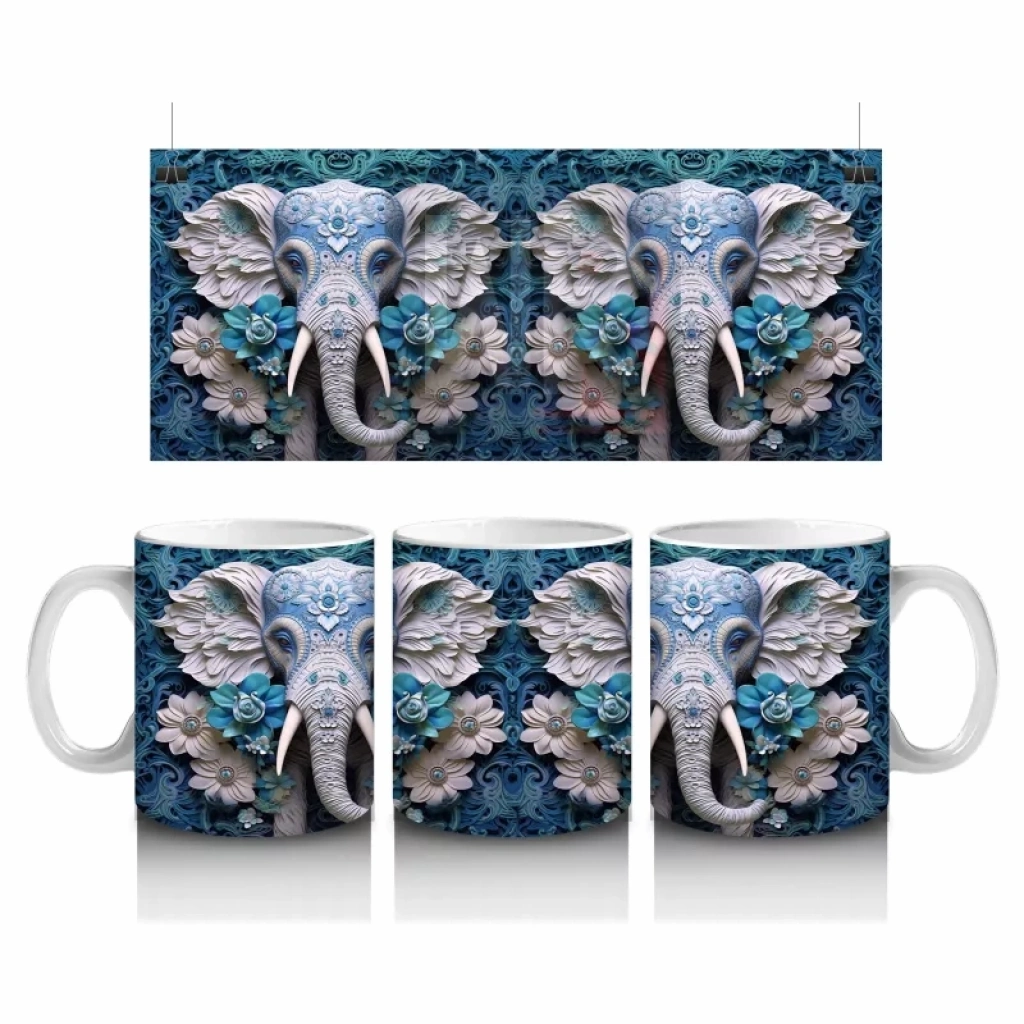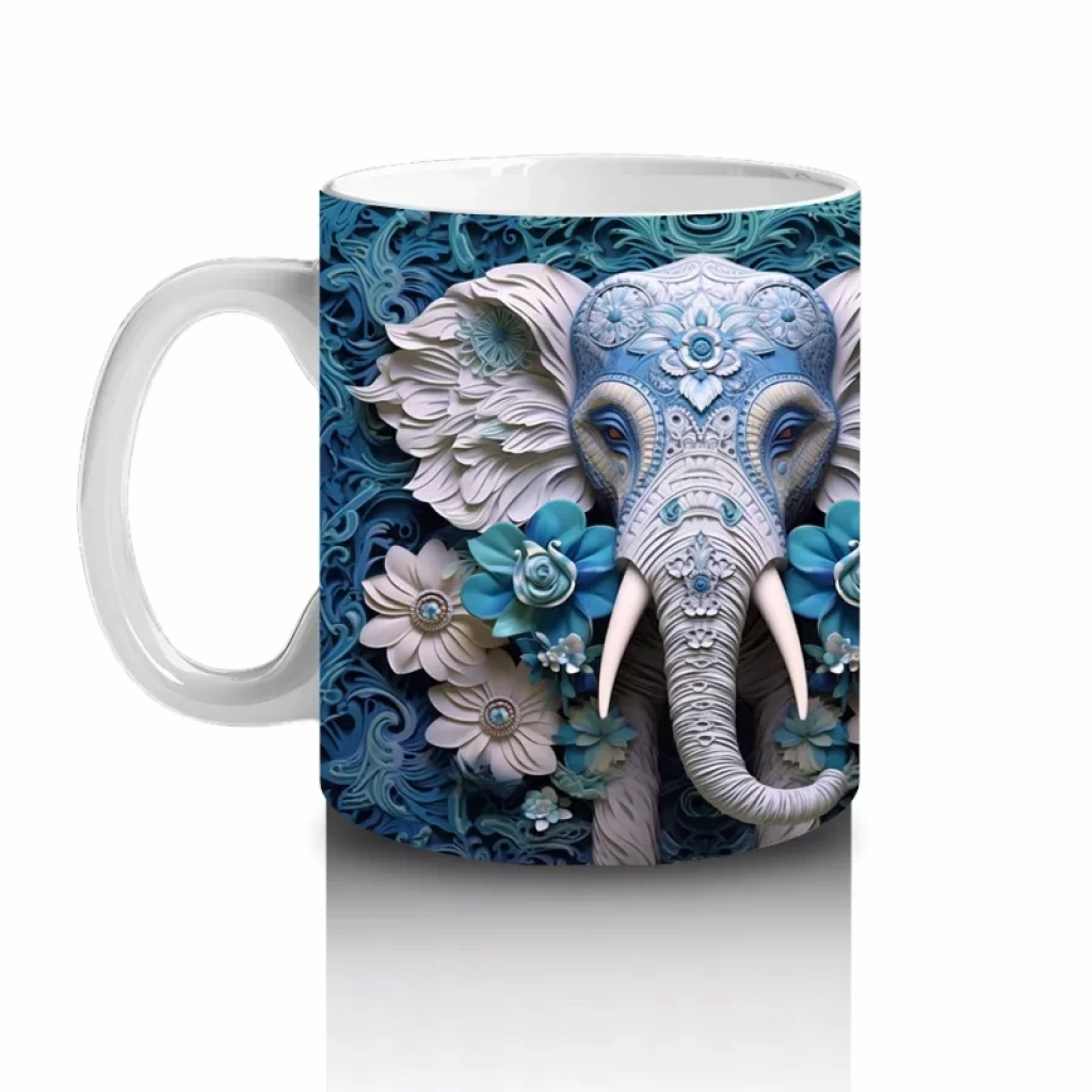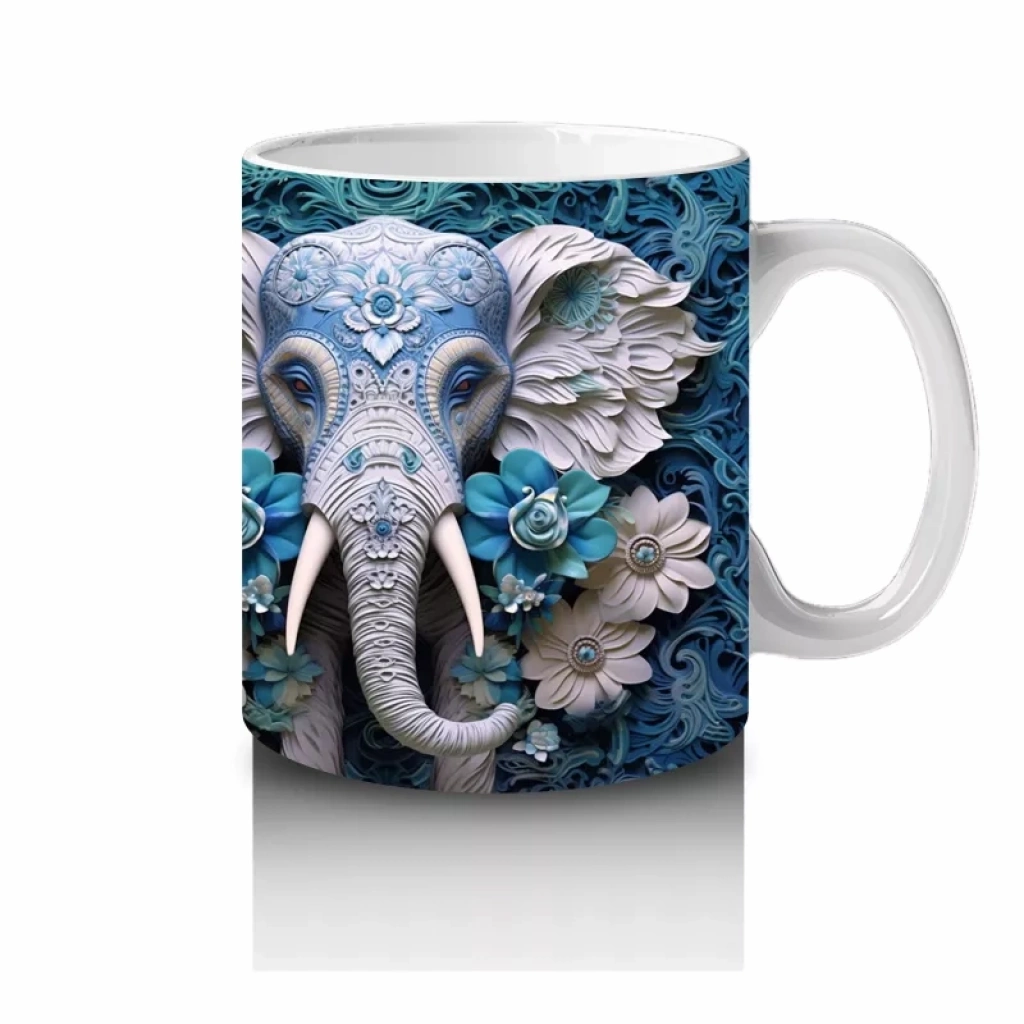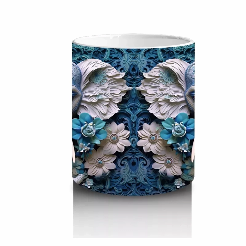 Mavi Çiçekler Arasında Fil Maskotu – Baskılı Kahve Kupası