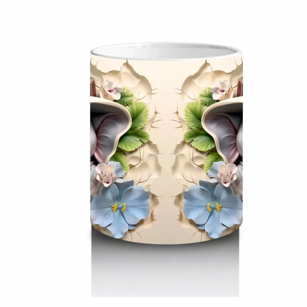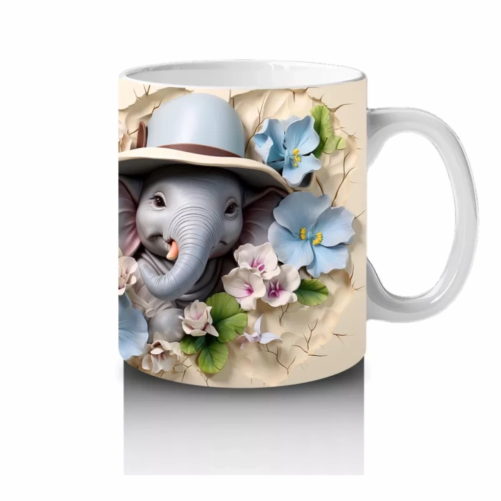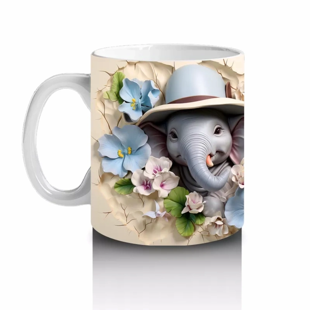 Şapkalarıyla dikkat çeken bu sevimli filler, mavi çiçeklerin arasındaki konumlarıyla hem eğlenceli hem de şık bir hava taşıyor. Hayvan figürlü neşeli kupalar arayanlara özel.