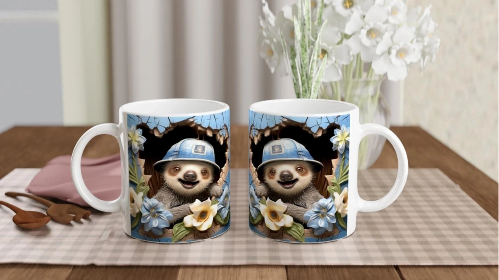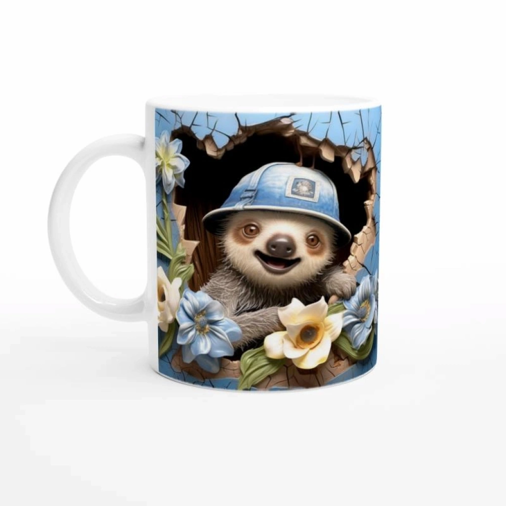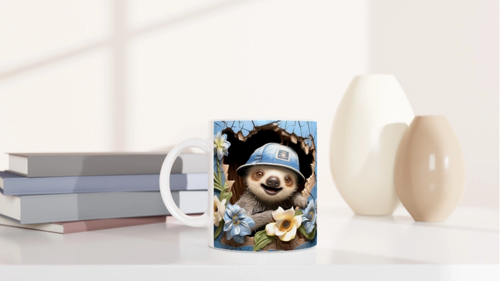 Mavi Duvardan Bakan Şapkalı Tembel Hayvan Temalı Baskılı Kupa Bardak, çatlak efektli mavi arka planı ve sarı-mavi çiçek detaylarıyla neşeli bir atmosfer oluşturur. Hem çocuklara hem içindeki çocuğu yaşatanlara özel sıcak bir hediye alternatifi.