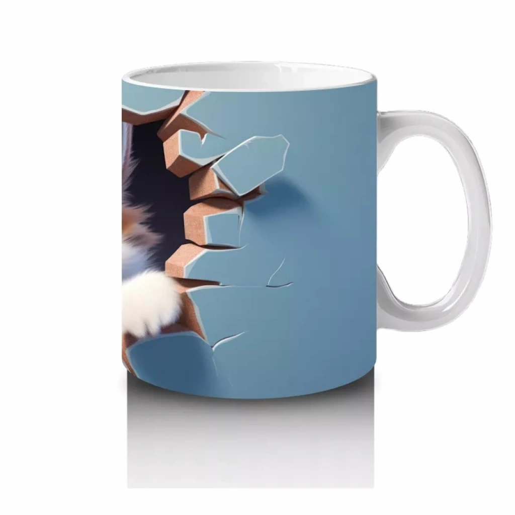 Mavi fon üzerine yırtık desenli kedi figürü, özgün ve modern bir görünüm sunuyor. Dinamik ve şık tasarımlar sevenlere hitap eden bir kupa.