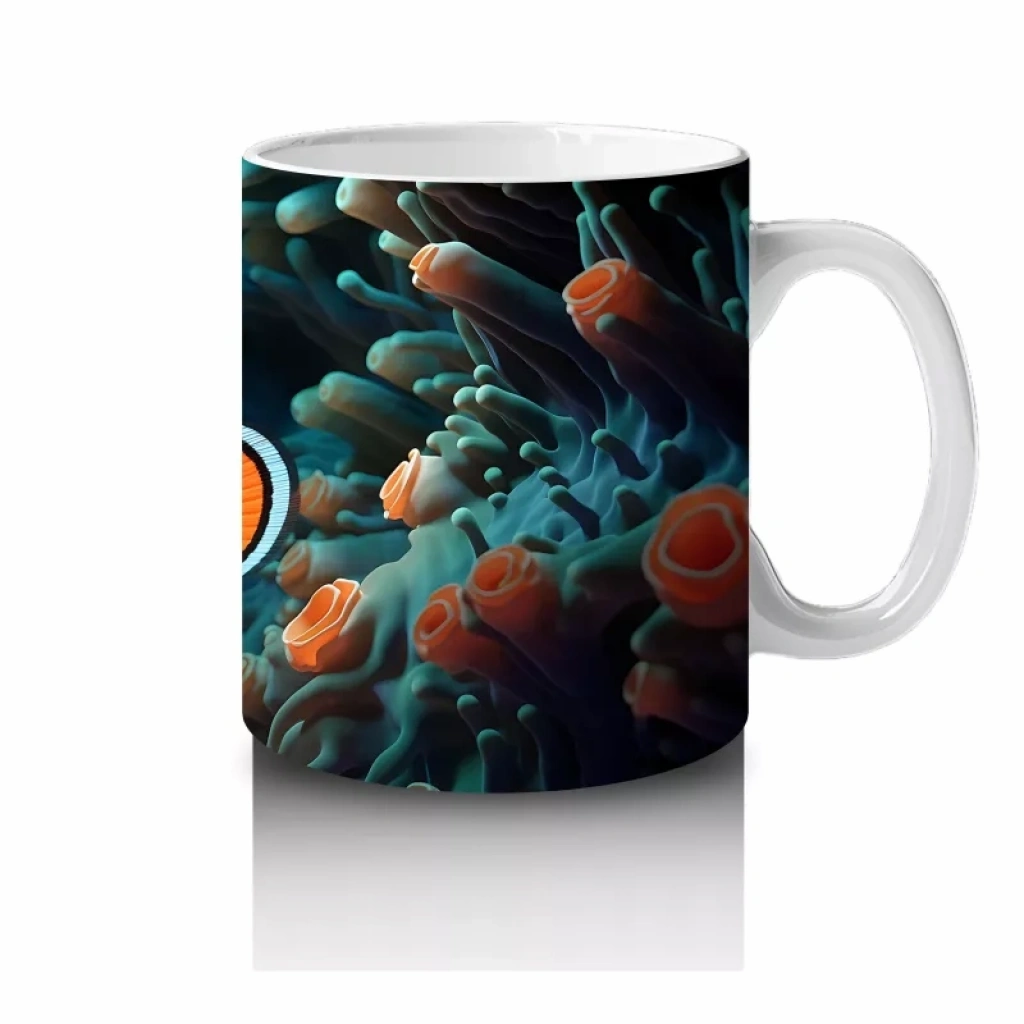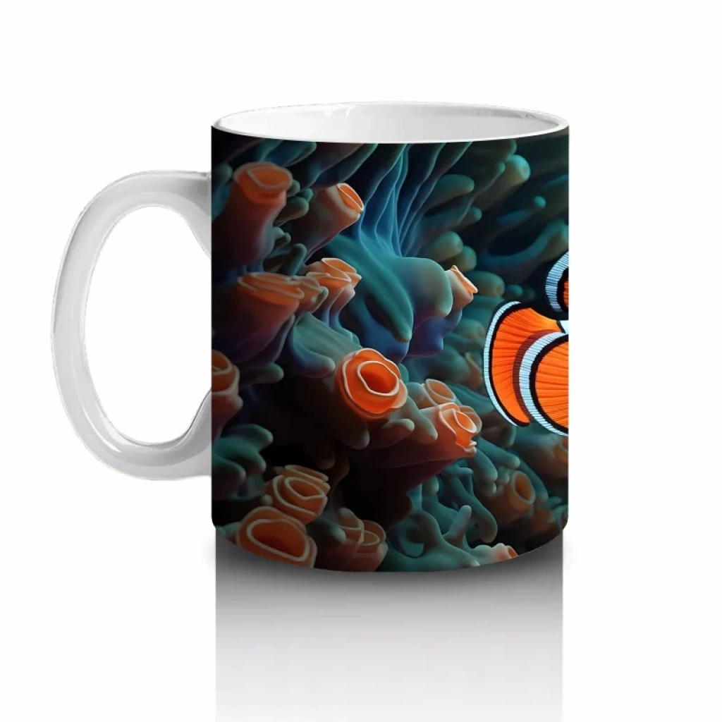 Mavi mercanların arasında süzülen palyaço balığı, deniz altı dünyasının renkli ve neşeli yüzünü yansıtıyor. Canlı ve eğlenceli detayları sevenler için özel bir kupa tasarımı.