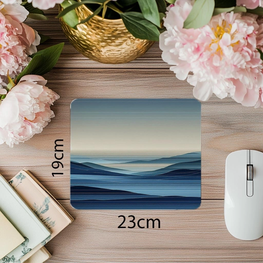 Mavi tonlarda hazırlanmış soyut manzara tasarımıyla bu mouse pad, sakinlik ve yaratıcılığı bir arada sunan modern bir atmosfer yaratır.