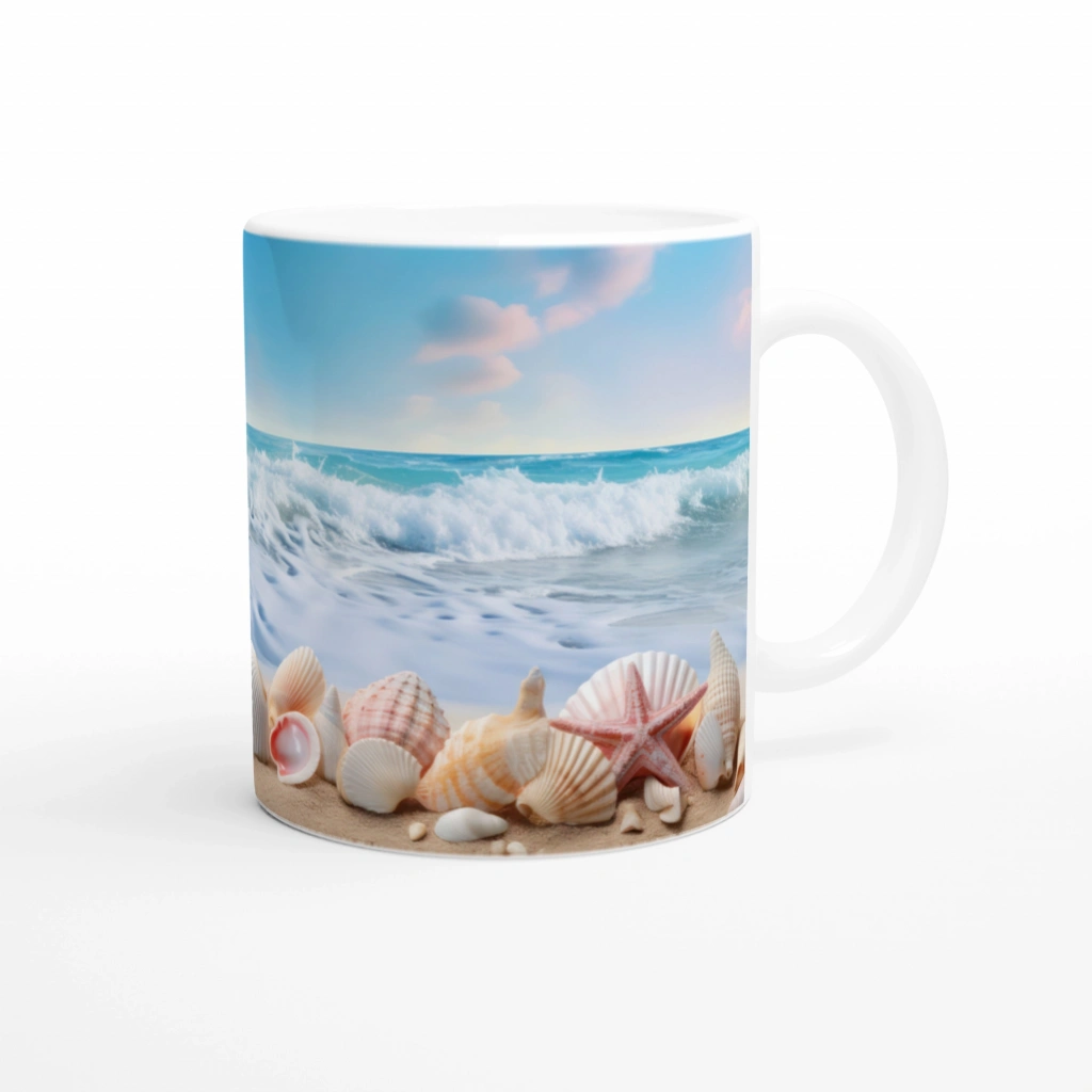 Geniş ufuklu deniz manzarası ve doğal kabuk detaylarıyla tasarlanan bu kupa bardak, yazın huzurunu yudumlamanıza eşlik eder.