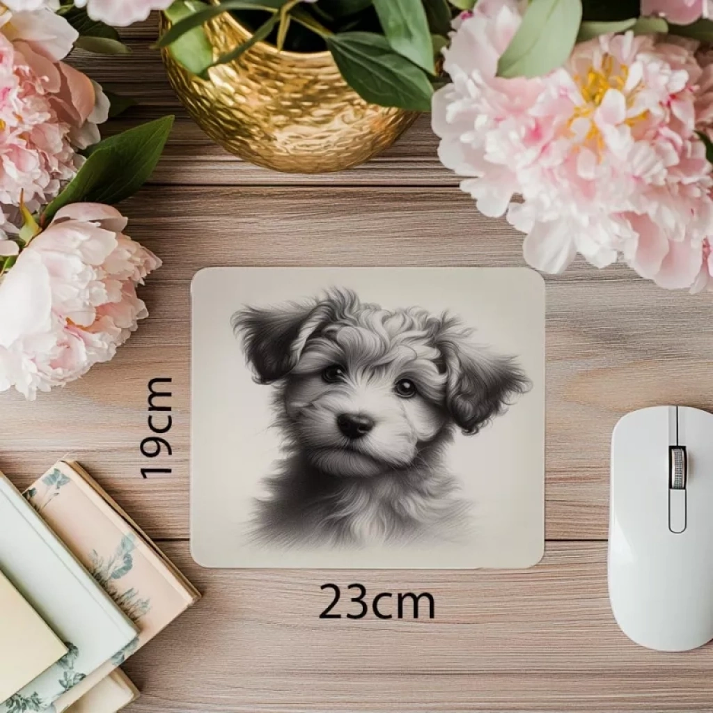 Meraklı bakışlı köpek illüstrasyonlu mousepad, yüksek hassasiyetli pürüzsüz yüzey ve kaymaz taban ile estetik ve konforlu kullanım sunar.
