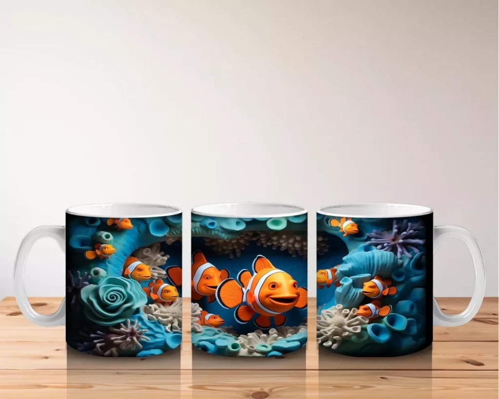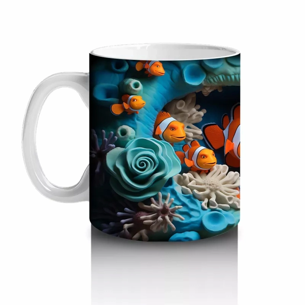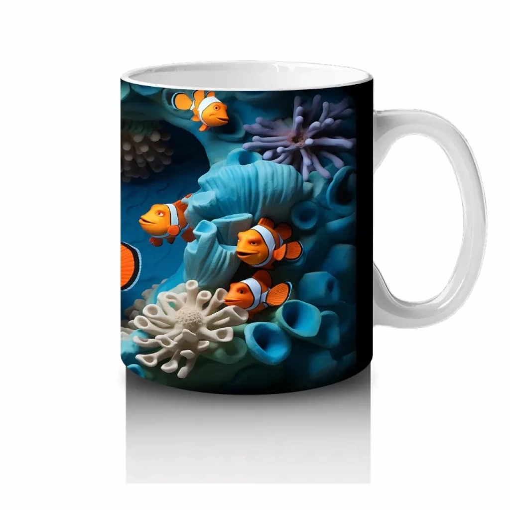 Mercan bahçesinin rengârenk ortamında keyifle yüzen balıklar, eğlenceli ve huzurlu bir deniz sahnesi oluşturuyor. Yaz enerjisini her yudumda hissettiren ferah bir kupa alternatifi.