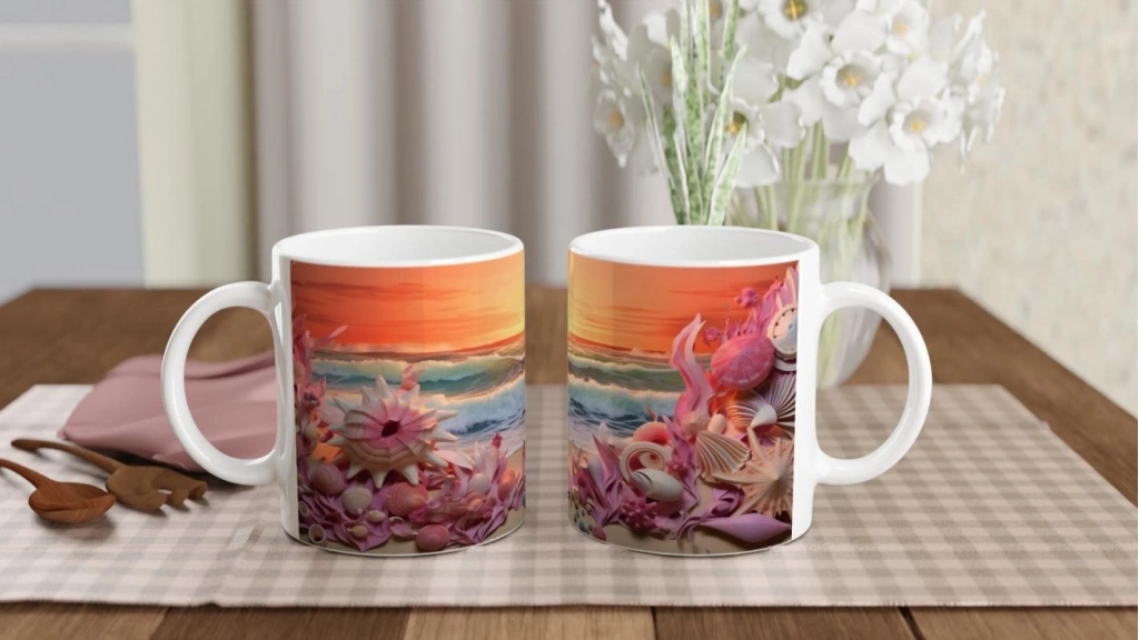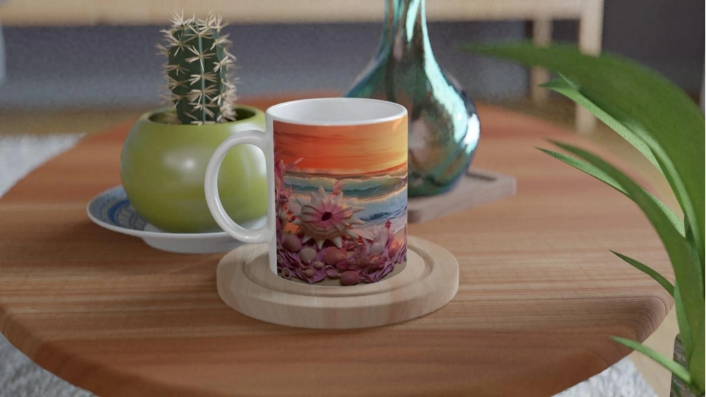 Mercan rengi deniz bitkileri ve zarif kabuklarla bezeli bu özel kupa bardak, deniz esintisini sofranıza taşıyor.