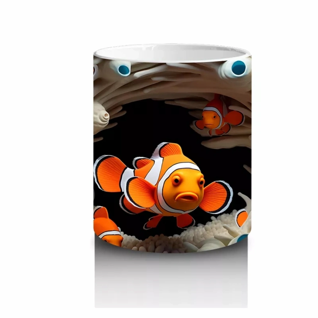 Mercan mağarasının derinliklerinde birlikte yüzen palyaço balığı çifti, uyum ve canlılığı yansıtan büyüleyici bir tasarım sunuyor. Deniz temalı hediye arayanlara özel, enerjik ve renkli bir kupa modeli.
