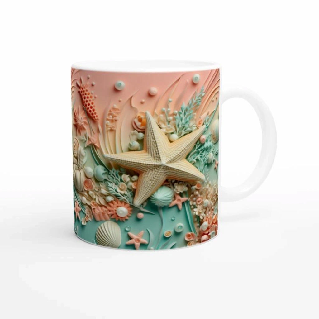 Mercanlar Arasında Deniz Yıldızı Temalı Baskılı Kupa Bardak, deniz kabukları, yosunlar ve mercan dokularıyla süslenmiş tasarımıyla yazın neşesini ve doğanın zarafetini bir arada sunar. Deniz tutkunları için göz alıcı ve huzur verici bir seçim.