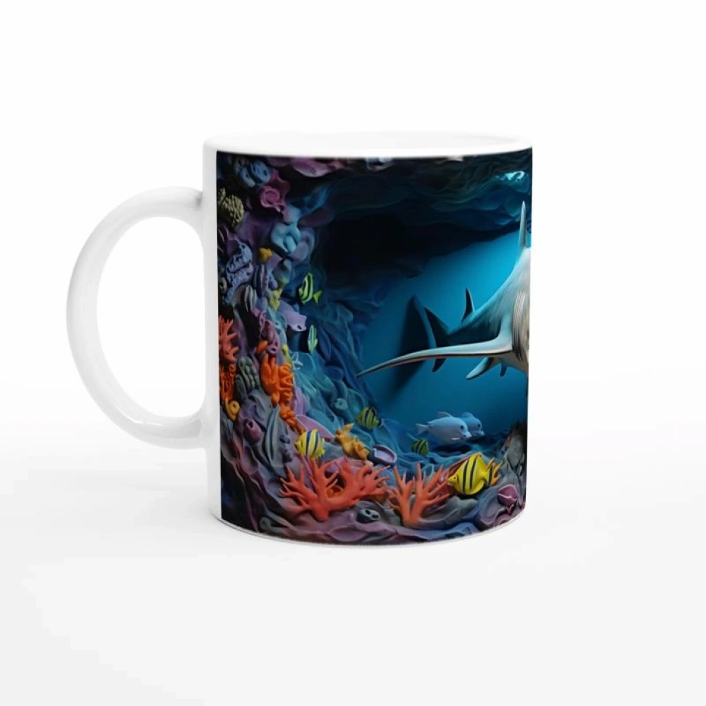 Canlı renkleri ve dinamik köpekbalığı illüstrasyonuyla Mercanlar Arasında Yüzen Tehlike Kupa Bardak, çocuklar ve deniz severler için eğlenceli ve dikkat çekici bir hediye seçeneğidir.