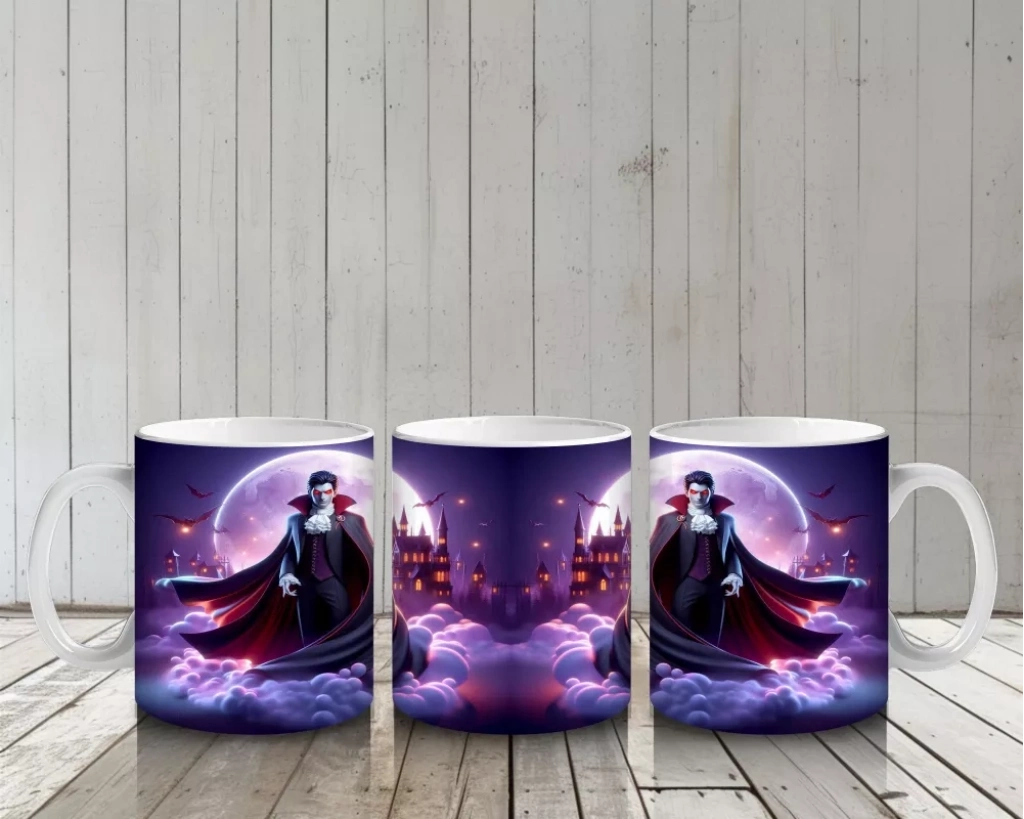 Mor ışıklı sahne üzerinde kırmızı pelerinli vampir figürüyle hazırlanan bu kupa, Halloween kutlamalarınıza çarpıcı ve etkileyici bir dokunuş yapar.