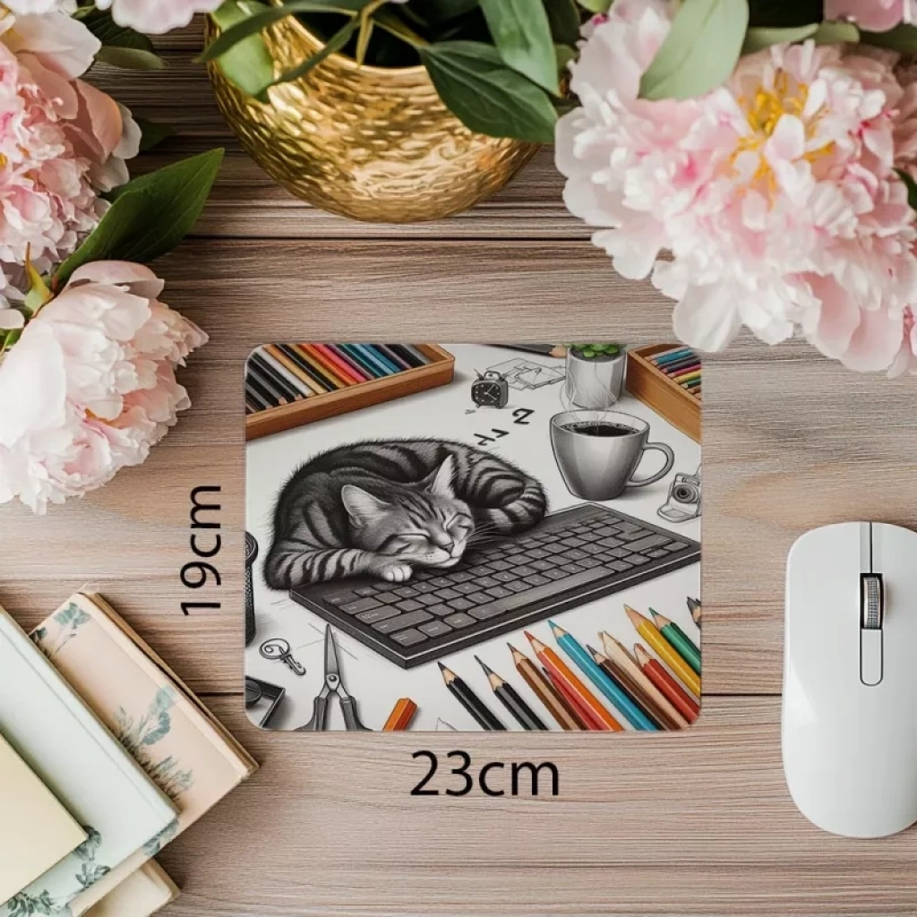 Ofis masasında kedi karakalem mousepad, detaylı çizimi ve pürüzsüz yüzeyiyle estetik ve konforlu kullanım sağlarken kaymaz tabanıyla sabit durur.