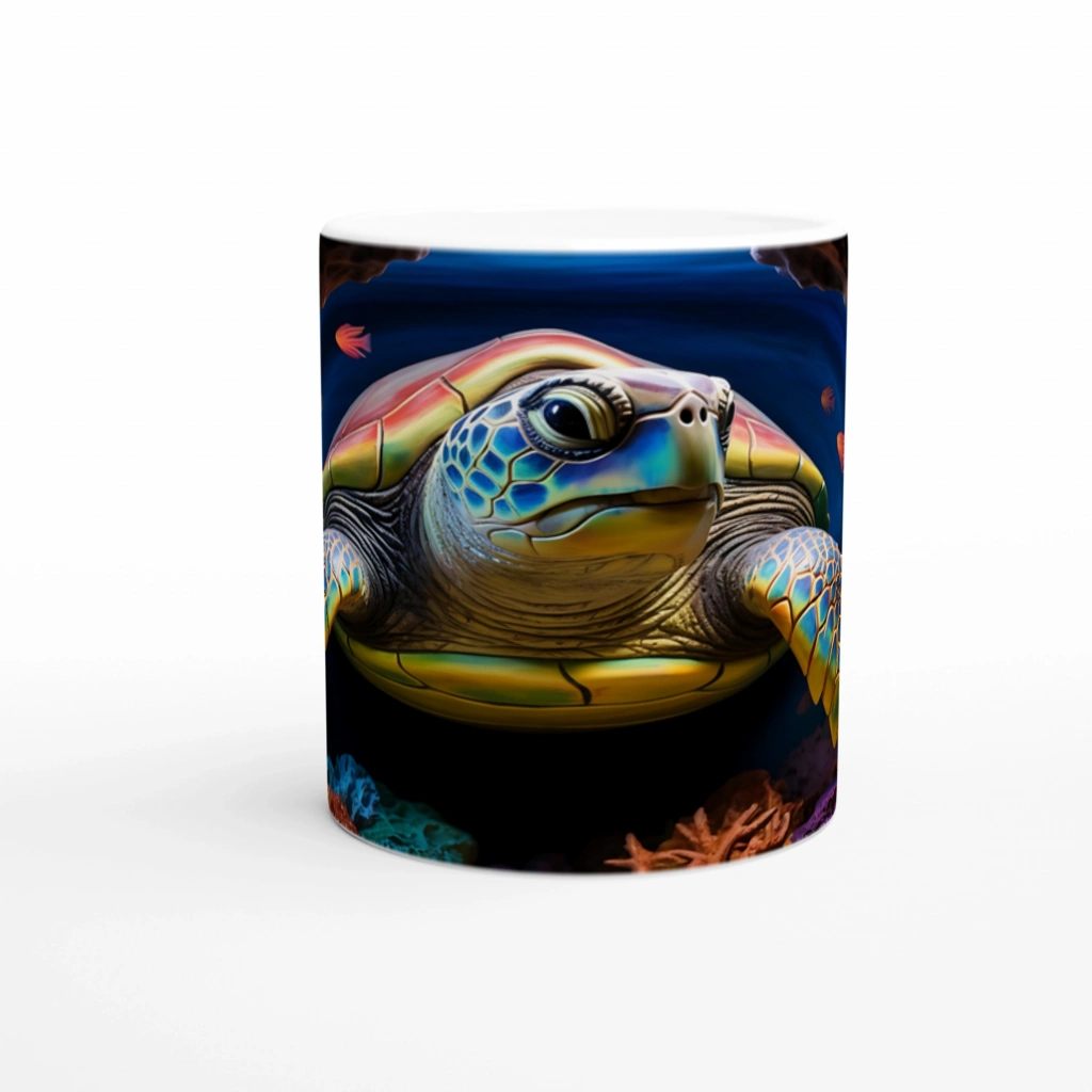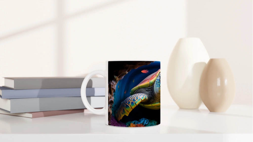 Derin deniz mavisinin içinde yüzen renkli kaplumbağayla süslenmiş bu özel kupa bardak, içecek keyfinizi görsel bir şölene dönüştürüyor.
