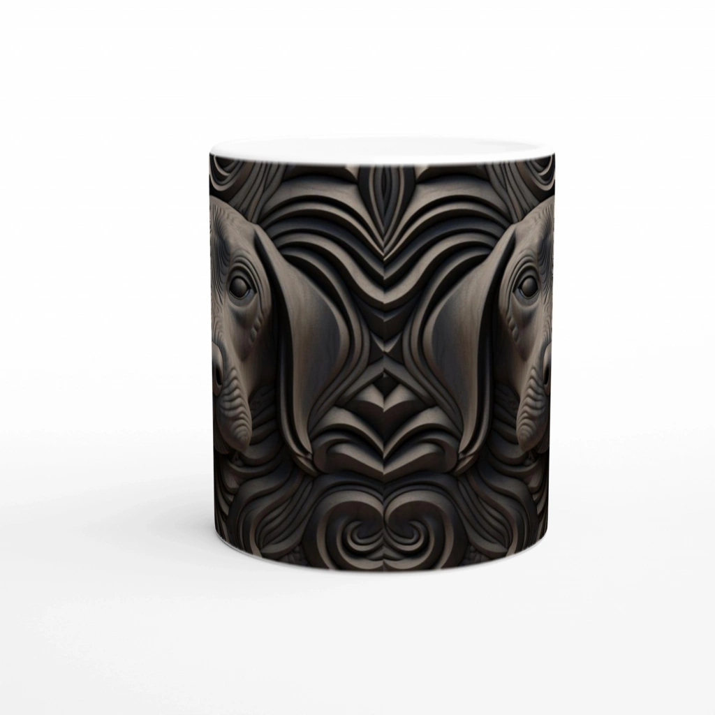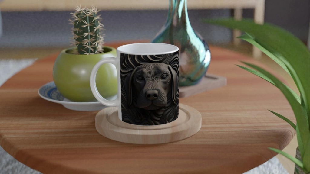 Derin dokulu, oyma efektiyle tasarlanmış bu siyah köpek figürlü kupa bardak, hem sadeliği hem de sanatı bir araya getiriyor.
