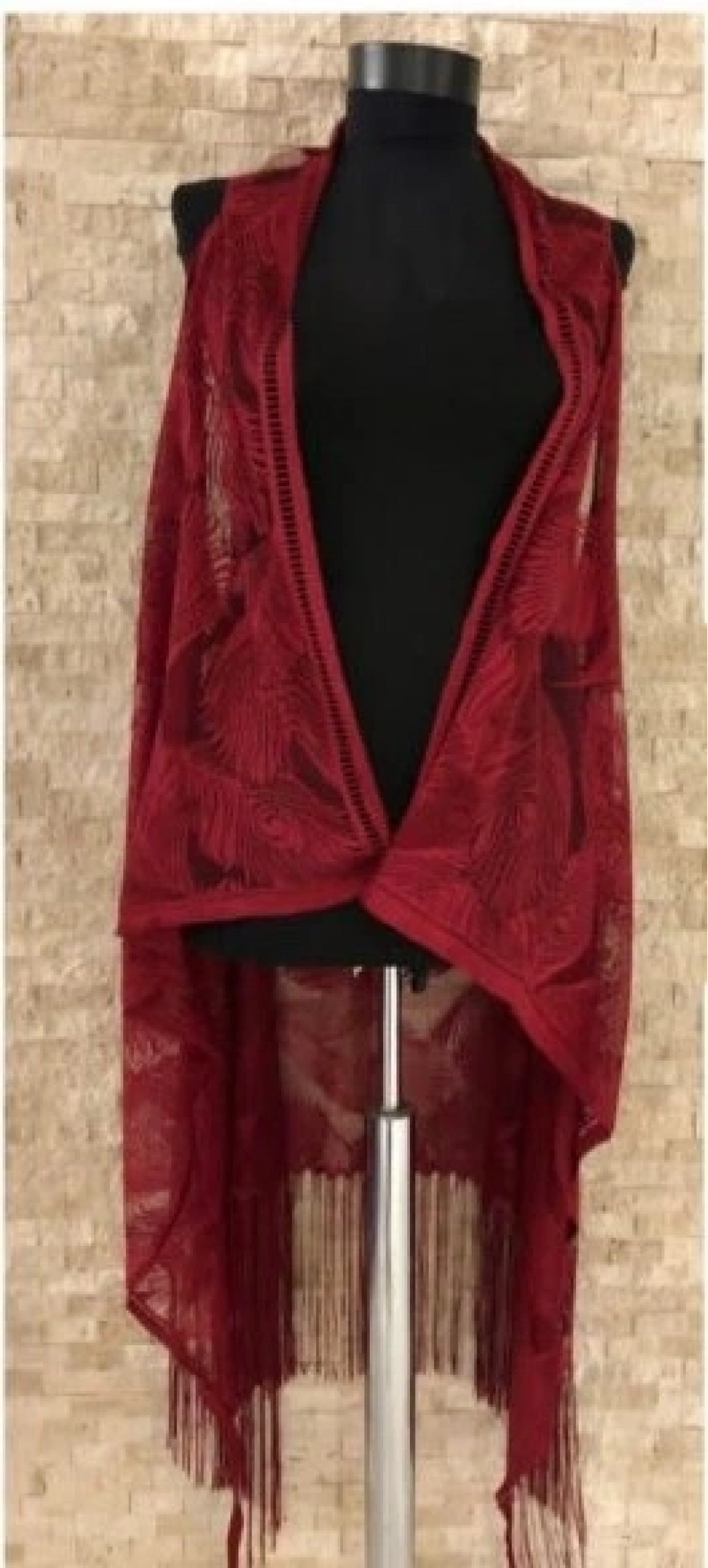 Pareo Dantel Yelek Mayo Bikini Üzeri Yaprak Desenli Püsküllü Plaj Elbisesi - Bordo