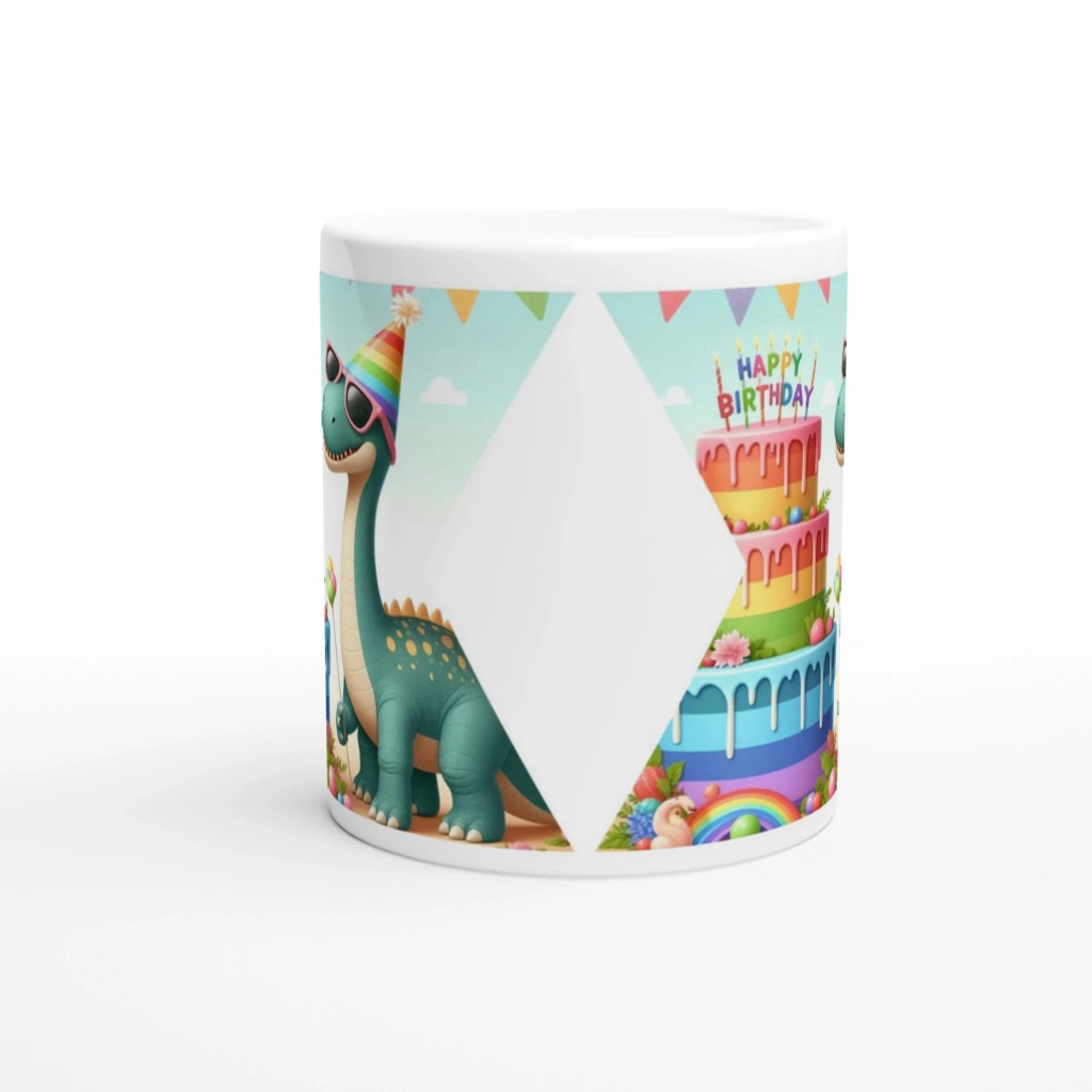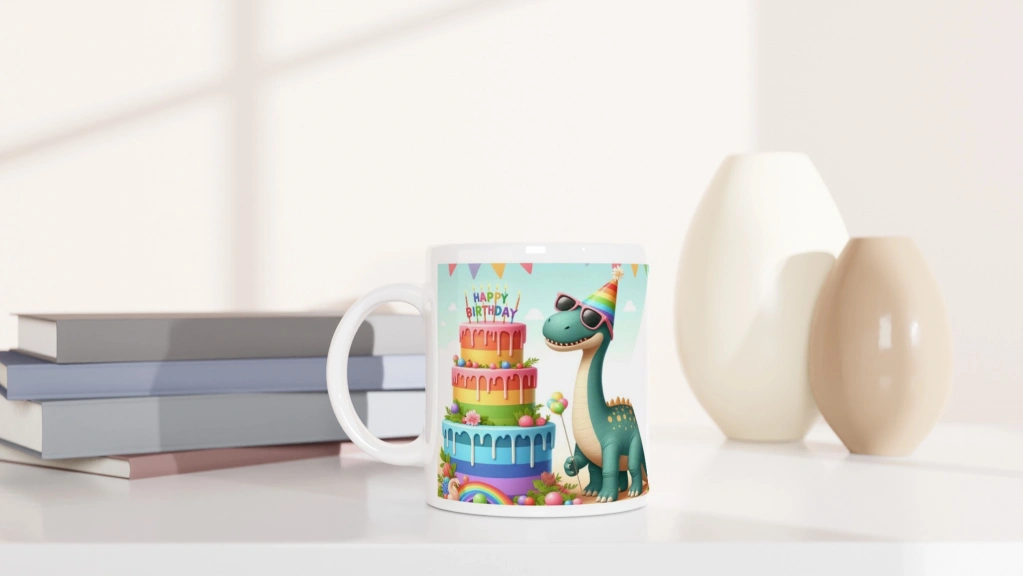 Çocuklara özel kupa, güneş gözlüklü neşeli dinozor ve renkli doğum günü pastası tasarımıyla partilere neşe katıyor.