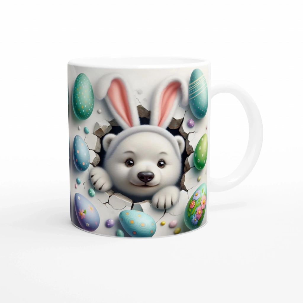 Paskalya Yumurtaları Arasında Tavşan Kulaklı Ayı Temalı Baskılı Kupa Bardak, kırık duvar deseninden sevimlice bakan ayıcık ve etrafındaki süslü yumurtalarla çocuklara ve içindeki çocuğu yaşatanlara hitap ediyor. Neşeli ve yumuşak tasarımıyla özel günlerde hediye olarak öne çıkıyor.